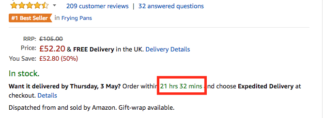 A very discrete type of scarcity is a simple timer that shows how many hours are left until the next-day delivery cut off time. This creates urgency in the minds of customers.