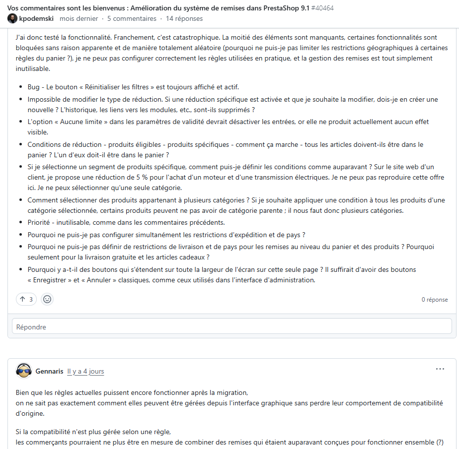 Bonjour à tous, Nous exploitons actuellement une boutique PrestaShop 1.6.0.6, développée en PHP 5.4, en production depuis maintenant près de 10 ans. Dans un objectif de modernisation globale (thème, fonctionnalités, performances et expérience utilisateur), nous souhaitons migrer vers une version plus récente de PrestaShop. L’idée serait de mettre en place une pré-production sur un sous-domaine, probablement en PrestaShop 9.0.2, afin de travailler proprement avant bascule. Concernant les modules : nous utilisons des modules achetés sur Addons, mais aussi beaucoup de modules développés en interne. Cela ne nous pose pas de problème d’adapter nos modules, ni même d’en redévelopper une grande partie, sachant que 90 % d’entre eux sont relativement simples. Sachant que maintenant ChatGPT ou Gemini sont là si on veut accélérer le truc ;) Notre question est donc la suivante : Est-il pertinent de partir directement sur PrestaShop 9.0.2, afin de bénéficier d’une base solide, moderne et scalable pour les prochaines années, avec des mises à jour régulières ? Ou vaut-il mieux se concentrer sur une version 8.x, plus éprouvée aujourd’hui, même si elle peut sembler déjà « obsolète » à moyen terme ? Merci d’avance pour vos retours d’expérience et vos conseils 👍0 points