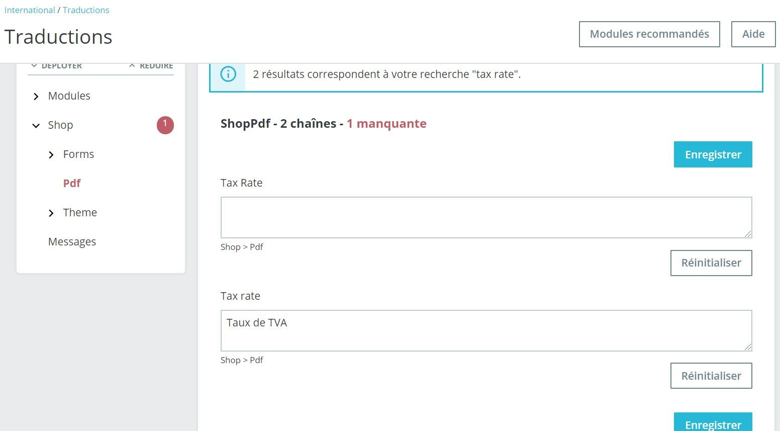 benjamin2010 Posted August 27, 2019 Share Posted August 27, 2019 Bonjour, Mon site a 2 languages FR et EN. J'essaie de modifier la traduction des factures mais je n'ai pas du tout le comportement attendu. J'utilise un template qui ne modifie pas les pdf, donc pour etre capable de modifier les traduction des factures j'ai vu sur un post qu'il fallait copier le repertoire pdf dans le repertoire du theme. C'est ce que j'ai fait. Suite a cela, je vois bien les champs que je peux modifier dans la section International / Traductions / Modifier la traduction. J'essaie de modifier la traduction du champ "Tax Rate", et lorsque je saisie "Tax Rate" dans la barre de recherche j'obtiens deux entrées. Je saisie pour les deux champs "Taux de TVA" mais lorsque j'enregistre les modification juste l'un des deux champs est enregistré, lorsque ne s'enregistre pas. Quand je passe une nouvelle commande pour verifier la generation de la facture, la traduction n'est pas pris en compte... Je ne sais pas si quelqu'un a deja eu ce genre de probleme? Merci beaucoup Merci beaucoup Link to comment Share on other sites More sharing options...