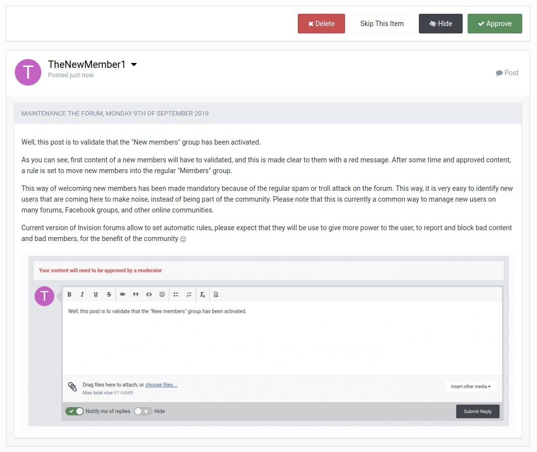 TheNewMember1 Posted November 4, 2019 Share Posted November 4, 2019 (edited) Well, this post is to validate that the "New members" group has been activated. As you can see, first content of a new members will have to validated, and this is made clear to them with a red message. After some time and approved content, a rule is set to move new members into the regular "Members" group. This way of welcoming new members has been made mandatory because of the regular spam or troll attack on the forum. This way, it is very easy to identify new users that are coming here to make noise, instead of being part of the community. Please note that this is currently a common way to manage new users on many forums, Facebook groups, and other online communities. Current version of Invision forums allow to set automatic rules, please expect that they will be use to give more power to the user, to report and block bad content and bad members, for the benefit of the community 😉 Edited November 4, 2019 by TheNewMember1 (see edit history) 4 Link to comment Share on other sites More sharing options...