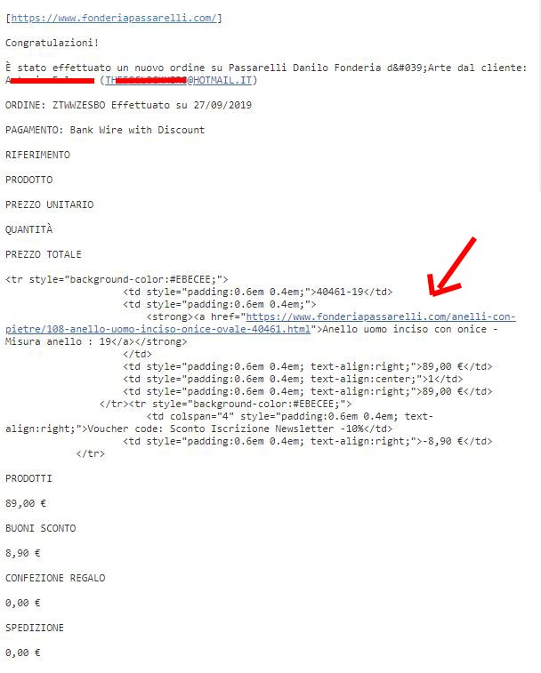 fonderiapassarelli Posted October 2, 2019 Share Posted October 2, 2019 Ora poi, osservando bene la foto che ho postato sopra e i dati contenuti nel mio order_conf.txt noto delle differenze: 1- La mail che mi arriva inizia con "Congratulazioni" ..., invece nel file txt c'è scritto: Salve ..... Grazie per aver ordinato presso il nostro negozio online ... 2-"Dettagli dell'ordine" non c'è nel file txt e molte altre cose sono in effetti diverse. Secondo me la mail che arriva al negoziante non sta nella cartella mails ma da qualche altra parte che ancora non ho scovato, è da un bel po' che la cerco, qualche idea? Link to comment Share on other sites More sharing options...
