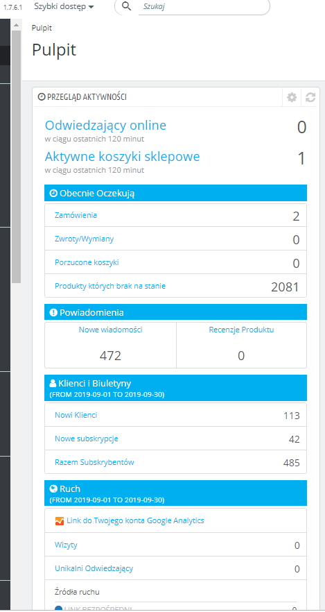 HASP Posted September 19, 2019 Share Posted September 19, 2019 Witam, Presta 1.7.6.1 mam problem z statami analitics w BO. Nie widzę ilości odwiedzających ani danych o ruchu. Kopalnia danych włączona. Analitics ma wpisane ID. Jakieś sugestie? Dzięki Link to comment Share on other sites More sharing options...