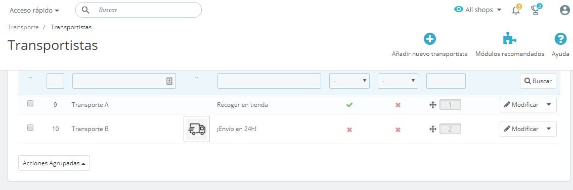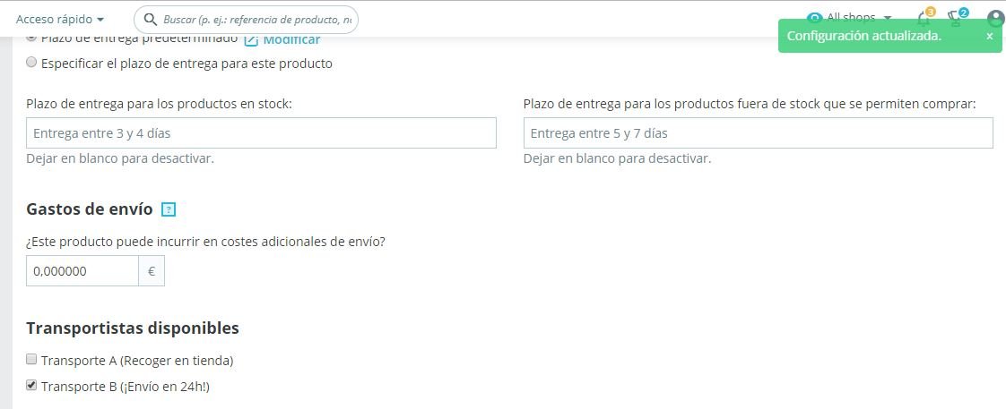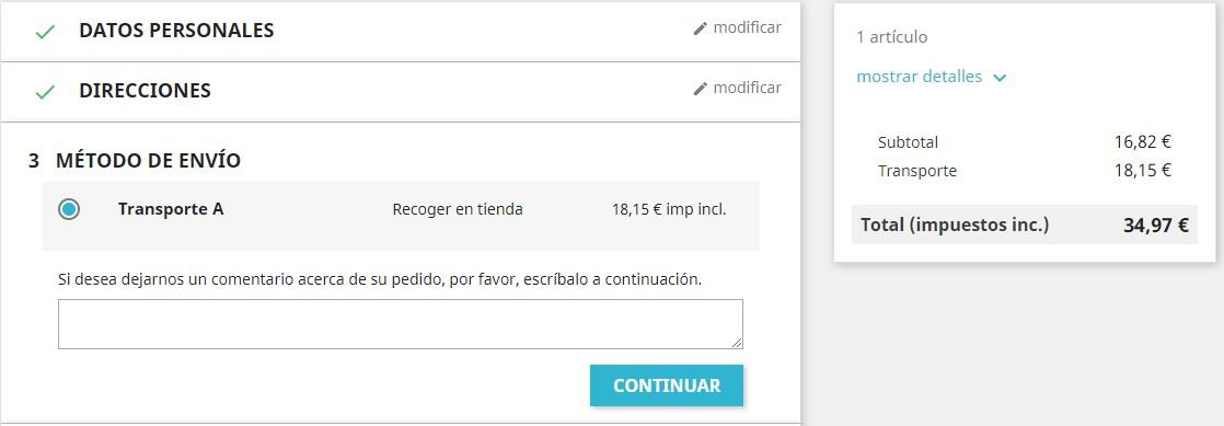 peskaero Posted October 4, 2019 Author Share Posted October 4, 2019 27 minutes ago, solucioneseb said: Si desactivas el transportista, por mucho que lo tengas asignado al producto no te lo va a mostrar y no te va a funcionar, tienes que tenerlo activado.. No se si te he entendido bien , en caso contrario detallanos el problema e intentamos seguir ayudandote Salds! Hola, Haber el problema está en que si tengo el producto donde le indico solo un transportista llamémoslo A. Y el transportista los deshabilito. Si tengo un transportista B activado me deja comprar el producto con el transportista B. Yo he obligado a qué solo sea el transportista A por tanto no debería dejarme comprar el producto Link to comment Share on other sites More sharing options...