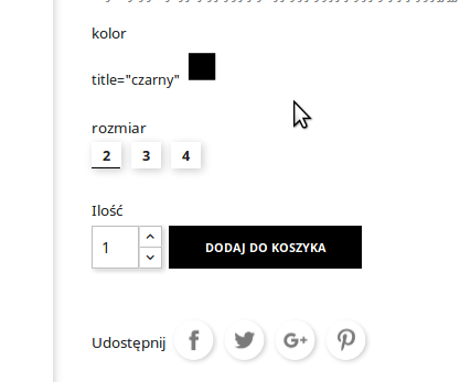 Zainstalowałem powyższy moduł służący do wyświetlania nazwy koloru produktu.Działa połowicznie tzn.po kliknięciu na wybrany kolor, pojawia się nad nim jego nazwa. Natomiast brakuje mi wyświetlania tzw. title po najechaniu kursorem. Na zrzucie zaznaczyłem o co mi chodzi (nie jest to strona mojego sklepu).