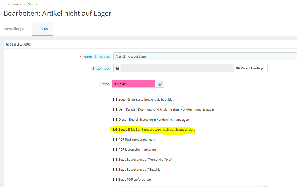 sero2kk Posted September 28, 2019 Author Share Posted September 28, 2019 (edited) hmm... ich kann dort nur die "Artikel nicht auf Lager" E-Mail-Benachrichtigung für den händler deaktivieren. nicht aber die mail die an den kunden gesendet wird... das problem entsteht quasi dadurch, das der status der bestellung automatisch auf "Artikel nicht auf Lager" geändert wird. warum das auch immer gemacht wird.. keine ahnung... aber sowie der status geändert wurde, geht die kunden email raus Edited September 28, 2019 by sero2kk (see edit history) Link to comment Share on other sites More sharing options...