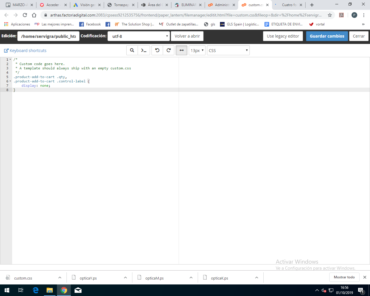 servigrafonline Posted September 30, 2019 Author Share Posted September 30, 2019 20 minutes ago, Prestafan33 said: /themes/nombre-de-tu-tema/assets/css/custom.css Si no existe el archivo, créalo y le pones simplemente lo que te he indicado. Si ya existe, añádelo al final de lo que ya contenga. Perdona, pero si tenía ese archivo, lo he añadido, pero me sigue apareciendo la cantidad Link to comment Share on other sites More sharing options...