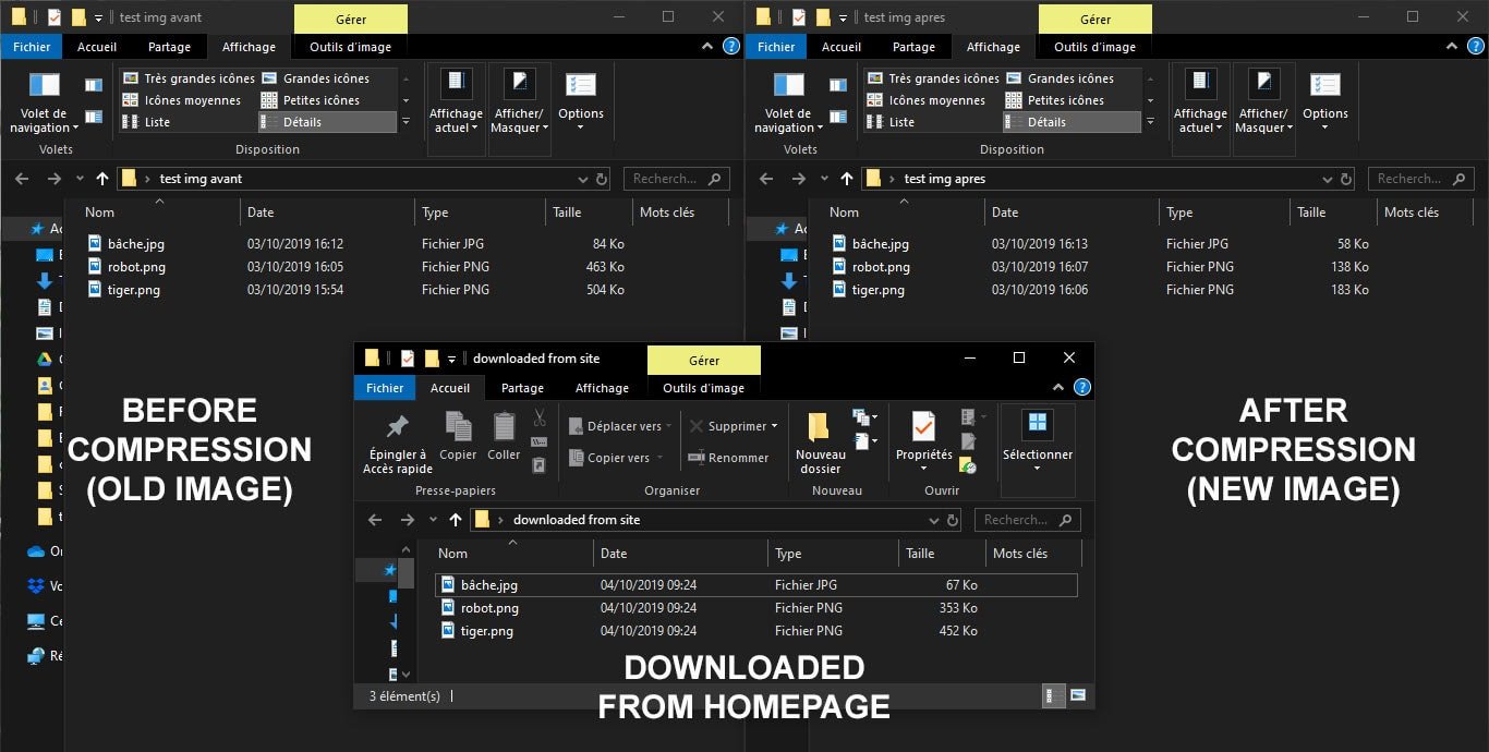 Bruckert Thomas Posted October 4, 2019 Share Posted October 4, 2019 Hi, just a quick question about prestashop. Yesterday I saw that our homepage slider was made with 3 images : 2 were about 450Ko and the third one was 100Ko (so 1,1Mo), which in my case is huge because pingdomtool says the homepage was about 2.6Mo. So I used ShortPixel to compress the images and from +/- 1Mo for the three images, they were reduced to 376Ko (for the three ones). I uploaded them into the slider module, I cleared the cache and then I reloaded the page. Then I reload my pingdom test and the webpage sized 2.6Mo again. I cleared the cache again and then try to upload a new slider image, it works perfectly. Then I downloaded the images of the slider from the webpage (inspect element, get the file URL and downloaded it). But they were 100% heavier than the one I uploaded ! The resized image uploaded sized 157Ko. The one I downloaded from the front page of my website sized 352Ko (as you can see on the file below). Is there a solution to decrease those images files ? Link to comment Share on other sites More sharing options...
