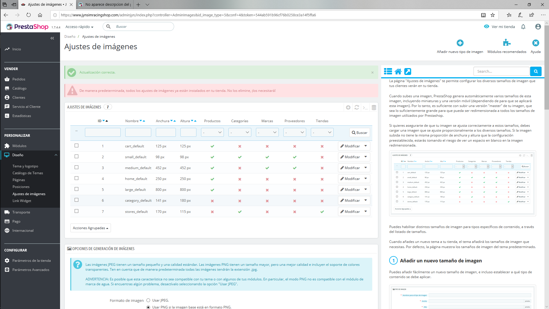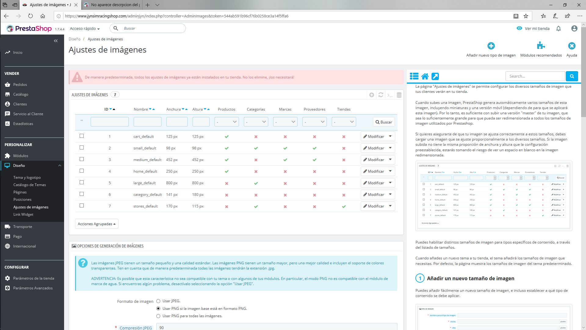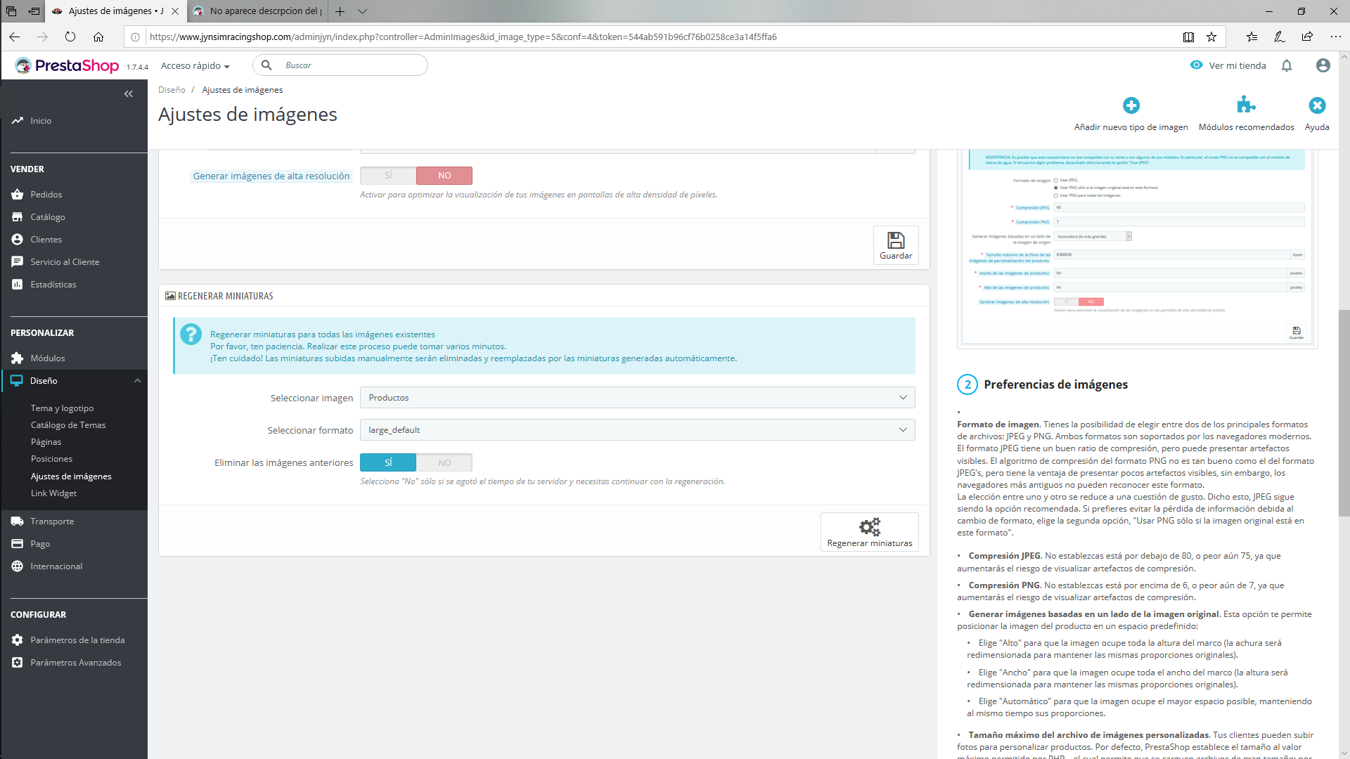 gusman126 Posted October 7, 2019 Share Posted October 7, 2019 hace 1 hora, Joaquin 14 dijo: que yo sepa no,no he borrado nada,te mando captura de imágenes a ver si esta bien. Large default debe estar activado para productos, esta desactivado. La plantilla esta intentando llamar la imagen y en el sistema no esta asignada errores. Activa que tambien se use en productos, alguien lo ha desactivado sin saber los problemas que puede ocasionar Ademas tienes un error 500 en el servidor. Puede ser debido a lo mismo, eliminar el tipo de imagen en el producto. Activa ese tipo de imagen y regenera imagenes, lo tienes abajo de la pagina de configuracion de imagenes. IMPORTANTE -> elige solo productos -> large_default Cuando hagas eso prueba a ver y di como has quedado. 2 Link to comment Share on other sites More sharing options...