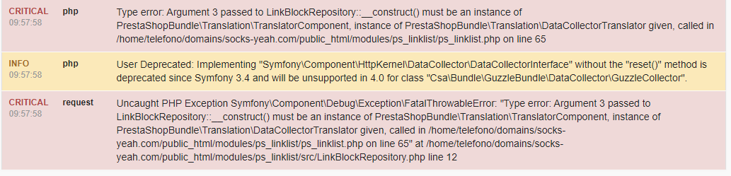 Type error: Argument 3 passed to LinkBlockRepository::__construct() must be an instance of PrestaShopBundle\Translation\TranslatorComponent, instance of PrestaShopBundle\Translation\DataCollectorTranslator given, called in /home/telefono/domains/socks-yeah.com/public_html/modules/ps_linklist/ps_linklist.php on line 65
