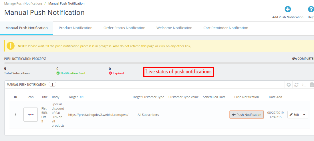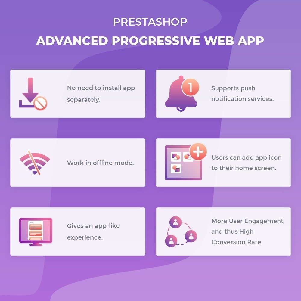 Webkul Modules Posted October 7, 2019 Share Posted October 7, 2019 Advance PWA | Offline, Push Notification, App, Firebase Module A Progressive Web App (PWA) uses modern web capabilities to deliver an app-like experience to users. Our Prestashop Advanced Progressive Web App gives the impression of a native app which enhances the overall user experience and keeps them engaged. It very well supports push notification enhancing your website functionality further more. Better Performance, More User Engagement and thus High Conversion Rate Front Office Demo- https://addons.prestashop.com/demo/FO20928.html Back Office Demo- https://addons.prestashop.com/demo/BO20928.html Purchase Link-https://addons.prestashop.com/en/website-performance/28920-advance-pwa-offline-push-notification-app-firebase.html Module Features- >>Admin can set the Application name as it will be displayed when App is opened on Mobile phones. >>Admin can set the Application’s Short name as it will be displayed on App Home Screen. >>Admin can enter the Splash Screen Background Color. >>Admin can upload the App Icon. >>Admin can upload the Push Notification Icon. >>Admin can create Push Notifications. >>Admin can Edit/Delete/Send Push Notifications. >>Admin can attach a Target URL when user clicks on Push Notification received. >>Admin can attach a separate Notification icon for each Push Notification >>Manual Push Notification- Admin can schedule the push notification. >>Product Notification- Admin can send the product notification from product edit page. >>Order Status Notification- Order status notification will be sent if the status of the order will be changed by the admin. >>Welcome Notification- Admin can send the welcome notification to the users if allowed by the users. >>Cart Reminder Notification- Admin can set the cart reminder notification with a specific number of days. >>Admin can manage the subscribers from “Manage Subscribers” tab. >>Admin can view/delete the list of notification history from “Manage Notification History” tab. >>Max. character limit for the short name of the app is 12. >>Module is now fully compatible with IOS. however, Push notification is not supported by PWA in IOS. >>Connectivity status(i.e offline/online) of app is now displayed at the end of screen of mobile. >>Now, product URL is automatically attached with product push notification. Purchase link- https://addons.prestashop.com/en/website-performance/28920-advance-pwa-offline-push-notification-app-firebase.html Query link- https://addons.prestashop.com/en/contact-us?id_product=28920 Amit Kushwaha/ Webkul Link to comment Share on other sites More sharing options...