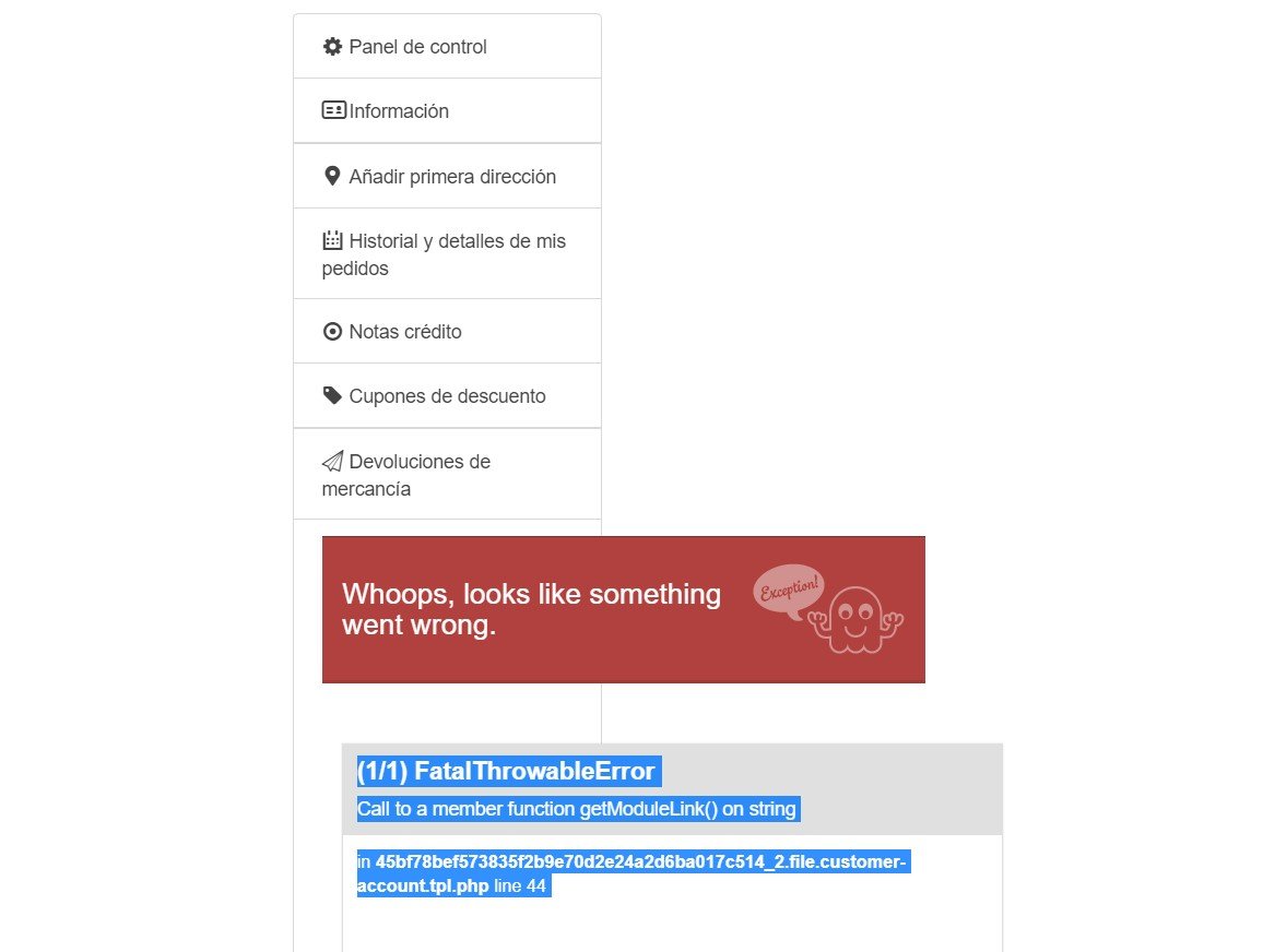 Deyvi Parra Posted October 11, 2019 Share Posted October 11, 2019 tengo una tienda Prestashop 1.7.5.0 corriendo en un servidor ubuntu 18.04 con php 7.2.21. El tema instalado es transformer theme y tengo el módulo JA Marketplace. El problema pasa al iniciar sesion con la cuenta de algunos vendedores y quiero entrar al apartado "mi cuenta". Cuando miro en las herramientas del navegador, en la pestaña network veo que hay un error 500 y en el html no está center-column, por esto no aparece el dashboard. Cuando ingreso a mi cuenta con otros perfiles no me salta este error. (1/1) FatalThrowableError Call to a member function getModuleLink() on string in 45bf78bef573835f2b9e70d2e24a2d6ba017c514_2.file.customer-account.tpl.php line 44 at content_5da0b584f30d11_36364393(object(SmartyDevTemplate)) in smarty_template_resource_base.php line 123 at Smarty_Template_Resource_Base->getRenderedTemplateCode(object(SmartyDevTemplate)) in smarty_template_compiled.php line 114 at Smarty_Template_Compiled->render(object(SmartyDevTemplate)) in smarty_internal_template.php line 216 at Smarty_Internal_Template->render(false, 0) in smarty_internal_templatebase.php line 232 at Smarty_Internal_TemplateBase->_execute(object(SmartyDevTemplate), null, null, null, 0) in smarty_internal_templatebase.php line 116 at Smarty_Internal_TemplateBase->fetch(null, null, null, null, false, true, false) in SmartyDevTemplate.php line 40 at SmartyDevTemplateCore->fetch() in Module.php line 2375 at ModuleCore->display('/var/www/html/clonatu/modules/jmarketplace/jmarketplace.php', 'customer-account.tpl') in jmarketplace.php line 4688 at Jmarketplace->hookDisplayCustomerAccount(array('smarty' => object(SmartyDevTemplate), 'cookie' => object(Cookie), 'cart' => object(Cart), 'altern' => 5)) in Hook.php line 966 at HookCore::coreCallHook(object(Jmarketplace), 'hookdisplayCustomeraccount', array('smarty' => object(SmartyDevTemplate), 'cookie' => object(Cookie), 'cart' => object(Cart), 'altern' => 5)) in Hook.php line 351 at HookCore::callHookOn(object(Jmarketplace), 'displayCustomeraccount', array('smarty' => object(SmartyDevTemplate), 'cookie' => object(Cookie), 'cart' => object(Cart), 'altern' => 5)) in Hook.php line 903 at HookCore::exec('displayCustomeraccount', array('smarty' => object(SmartyDevTemplate), 'cookie' => object(Cookie), 'cart' => object(Cart), 'altern' => 5), null) in smarty.config.inc.php line 165 at smartyHook(array('h' => 'displayCustomeraccount'), object(SmartyDevTemplate)) in SmartyLazyRegister.php line 83 at SmartyLazyRegister->__call('smartyHook', array(array('h' => 'displayCustomeraccount'), object(SmartyDevTemplate))) in ce1448e09011f92c4d9007957728557cc2d67538_2.file.my-account-items.tpl.php line 124 at Block_18378154415da0b584f15439_77278100->callBlock(object(SmartyDevTemplate)) in smarty_internal_runtime_inheritance.php line 248 at Smarty_Internal_Runtime_Inheritance->callBlock(object(Block_18378154415da0b584f15439_77278100), object(SmartyDevTemplate)) in smarty_internal_runtime_inheritance.php line 184 at Smarty_Internal_Runtime_Inheritance->process(object(SmartyDevTemplate), object(Block_18378154415da0b584f15439_77278100)) in smarty_internal_runtime_inheritance.php line 156 at Smarty_Internal_Runtime_Inheritance->instanceBlock(object(SmartyDevTemplate), 'Block_18378154415da0b584f15439_77278100', 'display_customer_account') in ce1448e09011f92c4d9007957728557cc2d67538_2.file.my-account-items.tpl.php line 110 at content_5da0b584f15da2_66923757(object(SmartyDevTemplate)) in smarty_template_resource_base.php line 123 at Smarty_Template_Resource_Base->getRenderedTemplateCode(object(SmartyDevTemplate)) in smarty_template_compiled.php line 114 at Smarty_Template_Compiled->render(object(SmartyDevTemplate)) in smarty_internal_template.php line 216 at Smarty_Internal_Template->render() in smarty_internal_template.php line 385 at Smarty_Internal_Template->_subTemplateRender('file:customer/_partials/my-account-items.tpl', null, 'layouts/layout-full-width.tpl', 0, 31536000, array(), 0, false) in 478b32d5af2779b9a5a0c23aeda8ea7f70addca9_2.file.my-account-nav.tpl.php line 27 at content_5da0b584f08ef8_21973048(object(SmartyDevTemplate)) in smarty_template_resource_base.php line 123 at Smarty_Template_Resource_Base->getRenderedTemplateCode(object(SmartyDevTemplate)) in smarty_template_compiled.php line 114 at Smarty_Template_Compiled->render(object(SmartyDevTemplate)) in smarty_internal_template.php line 216 at Smarty_Internal_Template->render() in smarty_internal_template.php line 385 at Smarty_Internal_Template->_subTemplateRender('file:customer/_partials/my-account-nav.tpl', null, 'layouts/layout-full-width.tpl', 0, 31536000, array(), 0, false) in 6c651f57a36328209358a234e9b65b082a40d2d8_2.file.page.tpl.php line 67 at Block_18323052835da0b584ec65f1_72722871->callBlock(object(SmartyDevTemplate)) in smarty_internal_runtime_inheritance.php line 248 at Smarty_Internal_Runtime_Inheritance->callBlock(object(Block_18323052835da0b584ec65f1_72722871), object(SmartyDevTemplate)) in smarty_internal_runtime_inheritance.php line 184 at Smarty_Internal_Runtime_Inheritance->process(object(SmartyDevTemplate), object(Block_18323052835da0b584ec65f1_72722871)) in smarty_internal_runtime_inheritance.php line 156 at Smarty_Internal_Runtime_Inheritance->instanceBlock(object(SmartyDevTemplate), 'Block_18323052835da0b584ec65f1_72722871', 'account_links', 1) in 6c651f57a36328209358a234e9b65b082a40d2d8_2.file.page.tpl.php line 157 at Block_5404975585da0b584ec6209_47399254->callBlock(object(SmartyDevTemplate)) in smarty_internal_runtime_inheritance.php line 248 at Smarty_Internal_Runtime_Inheritance->callBlock(object(Block_5404975585da0b584ec6209_47399254), object(SmartyDevTemplate)) in smarty_internal_runtime_inheritance.php line 184 at Smarty_Internal_Runtime_Inheritance->process(object(SmartyDevTemplate), object(Block_5404975585da0b584ec6209_47399254), object(Block_6141945465da0b3d109ee35_67146184)) in smarty_internal_runtime_inheritance.php 