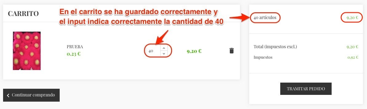 Cuando estás en el carrito y pinchas en el botón de + o -, selecciona la cantidad en múltiplos, pero cuando hace la llamada al ajax para actualizar la cantidad y el total del precio aumenta o disminuye la cantidad de uno en uno (hace un +1 o un -1). Si tengo 20 en la cantidad y le doy al + se pone bien en 40 se carga el ajax y el input da un salto y se pone en 21 por lo que actualiza la cantidad a 21 y luego el valor de input salta y se pone de nuevo en 20, pero ya se ha guardado la cantidad de 21.