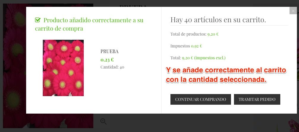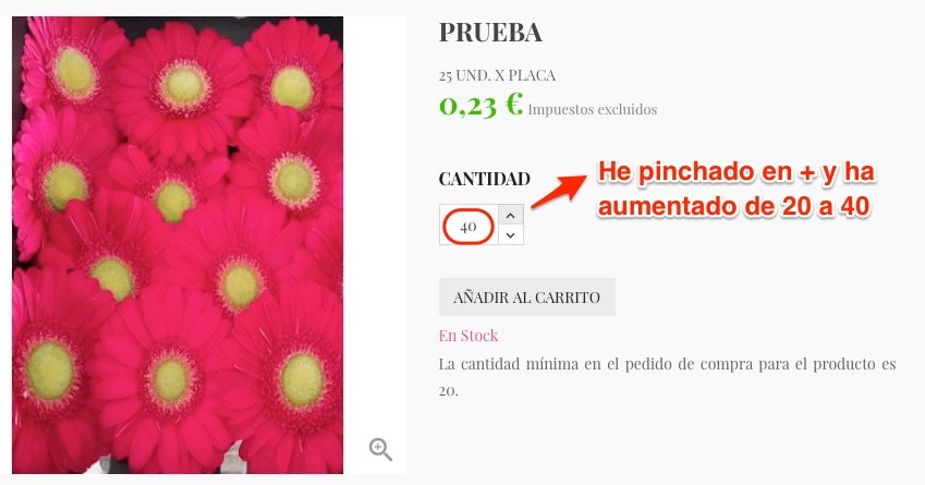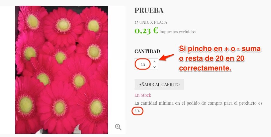 Estoy desarrollando una web de flores, donde el precio es por unidad de flor pero se compran por paquetes de varias flores, es decir, existe una cantidad mínima o cantidad de flores en el paquete, 20 por ejemplo, y no se pueden comprar ni 19 ni 21, sino que de 20 debería de pasar a 40, y de 40 a 60, y así sucesivamente.