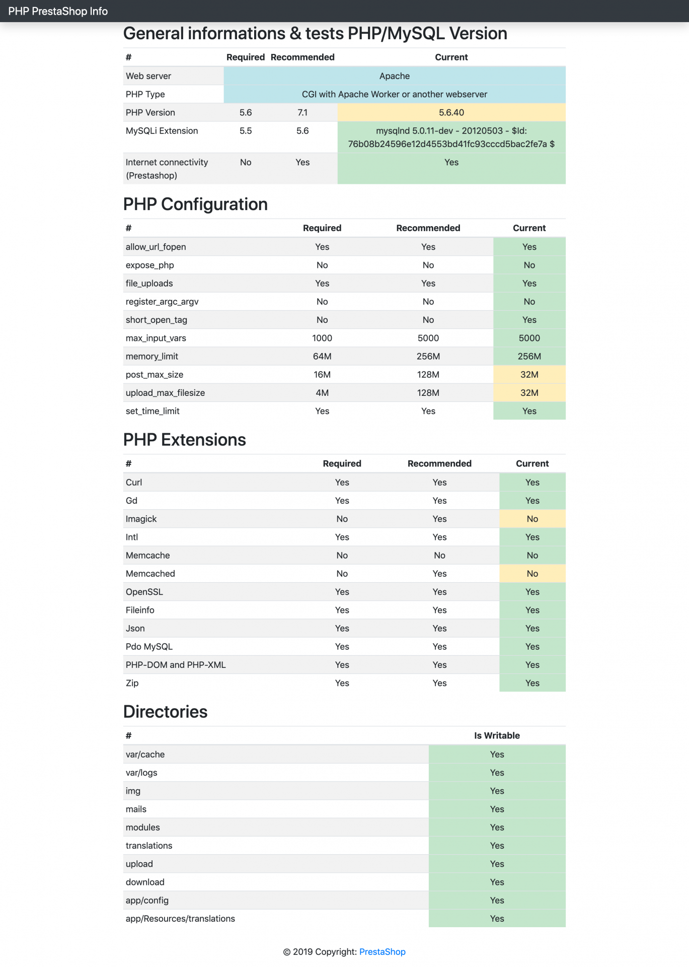 max willies Posted November 3, 2019 Share Posted November 3, 2019 (edited) anchio stesso identico problema. dbase InnoDB connessioni server to server senza restrizioni php_value memory_limit 256M php_value upload_max_filesize 32M php_value post_max_size 32M INSTALLAZIONE SU DOMINIO ALTERVISTA.ORG ho anche controllato la configurazione con il file php-ps-info come suggerito in altri post (scaricabile qui https://github.com/PrestaShop/php-ps-info) e tutti i parametri sembrano corretti allego file della pagina php-ps-info, installata nella stessa cartella dove ho scompattato il file in installazione prestashop.zip Grazie Max Edited November 3, 2019 by max willies (see edit history) Link to comment Share on other sites More sharing options...