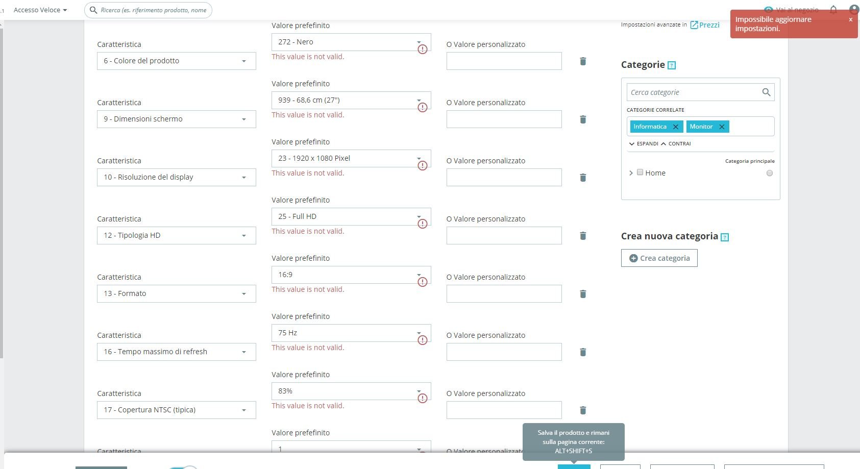 alexthemaster Posted October 31, 2019 Share Posted October 31, 2019 Salve a tutti mi succede un problema strano su PrestaShop... Se apro un qualsiasi prodotto ed aggiungo una caratteristica dall'elenco per esempio "6 - Colore del prodotto" e seleziono nero da un menu a tendina di 5 colori riesco a salvarlo. Se esco e rientro nel prodotto e da nero voglio farlo diventare di un altro colore nel menu a tendina del valore predefinito della caratteristica non ho più 6 voci ma tutte quelle disponibili di tutte le combinazioni e logicamente mi manda in errore il tutto. Se guardo il codice pagina però che una dicitura strana.. nella select option della caratteristica per esempio 6 - Colore del prodotto come value c'è 5 e così vale per tutti, scalati di 1 <option value="4">5 - Frame Size</option> <option value="5" selected="selected">6 - Colore del prodotto</option> <option value="6">7 - Tipo di prodotto</option> <option value="7">8 - Fattore di forma</option> <option value="8">9 - Dimensioni schermo</option> credo sia questo che mandi in errore tutto... Sapete darmi qualche suggerimento? Grazie Link to comment Share on other sites More sharing options...