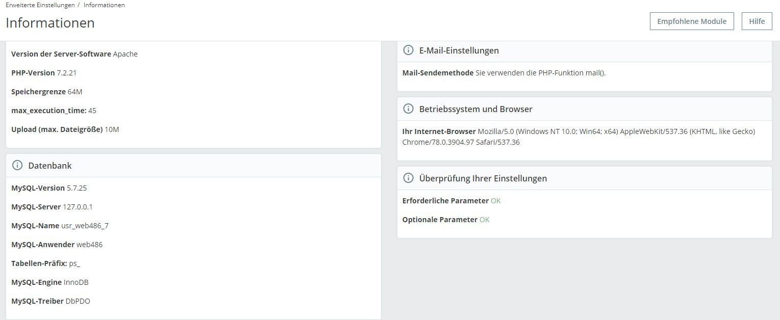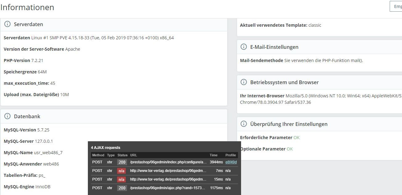 JBW Posted November 11, 2019 Share Posted November 11, 2019 Die Ajax Debug Meldungen musst du auf der Carrier Seite anschauen wenn der Fehler passiert ist. In deinen Einstellungen fällt mir nur die sehr niedrige Speichergrenze von 64MB und die kurze Script Execution Time auf, damit wirst du mit Presta 1.7. nicht glücklich. Würde min. 256MB, besser 512MB empfehlen und 300 Sec. für die Laufzeit. Siehe auch hier: Link to comment Share on other sites More sharing options...
