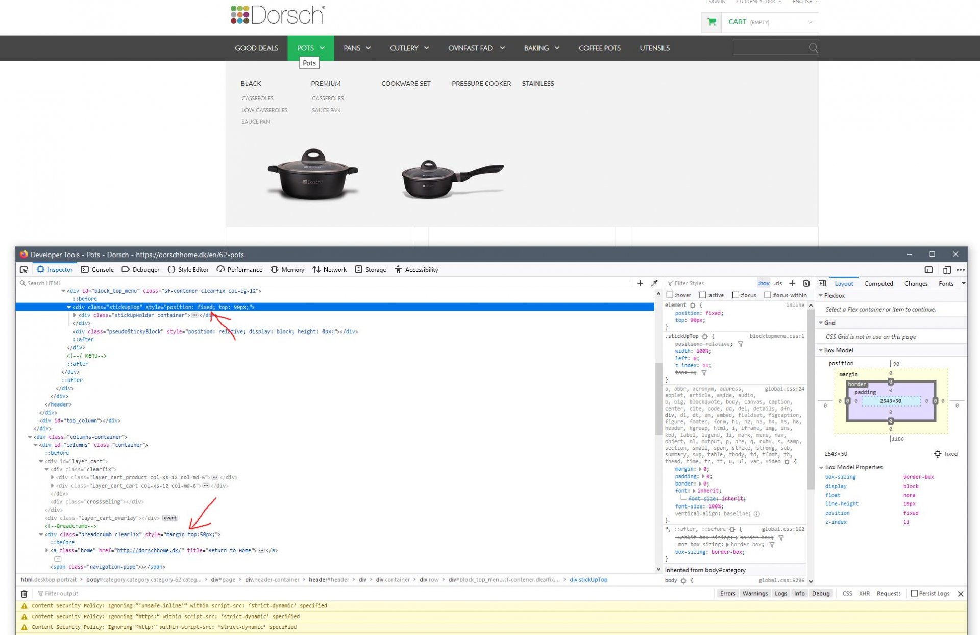 wkassem Posted November 12, 2019 Share Posted November 12, 2019 Hello, i am using custom theme inside prestashop 1.6.1.3 i am using sticky superfish top menu. In the home page, the menu works normally but in other pages the sub menu keep hidden inside the parent (Visible but no place to be shown) Home page: https://dorschhome.dk/ works Category page: https://dorschhome.dk/en/63-pans Not working Please Help Link to comment Share on other sites More sharing options...