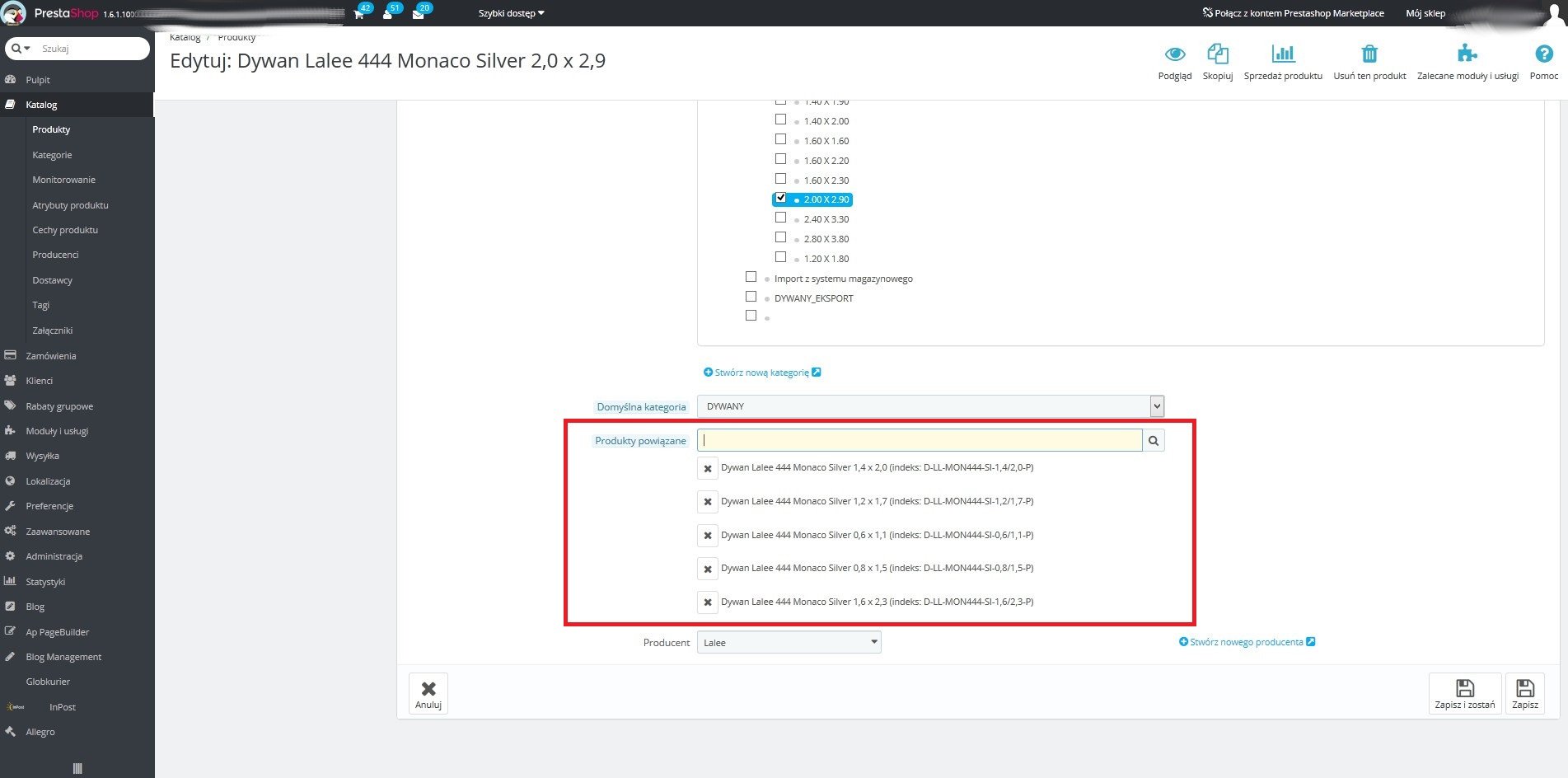 dodaję do produktu inne te same produkty o innych rozmiarach za pomocą funkcji Produkty Powiązane. Przypominam, że funkcja nie pozwala nam dodać obecnego produktu do powiązanych.
