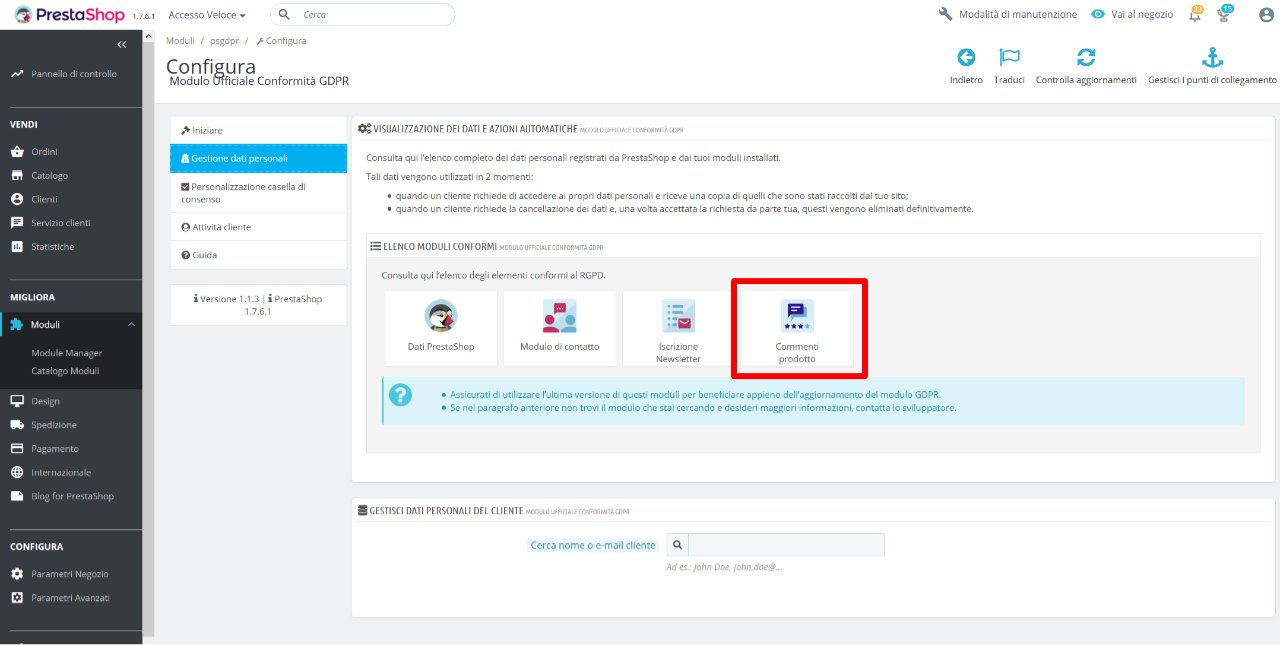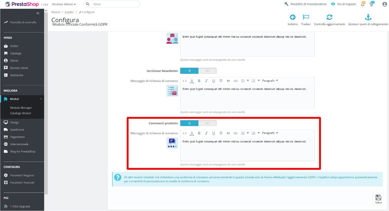 aledigit Posted November 18, 2019 Share Posted November 18, 2019 [PrestaShop 1.7.6.1 + Warehouse 4.3.2] Buongiorno, sto cercando di rendere il mio sito conforme alla normativa GDPR. Ho scaricato il Modulo Ufficiale Conformità GDPR e ho problemi con il modulo Commenti prodotto. Il modulo compare nell'elenco dei moduli conformi al Modulo Ufficiale Conformità GDPR (immagine-1 allegata), ma nonostante abbia attivato l'inserimento del testo con casella di spunta (immagine-2 allegata), quando si inserisce una recensione il testo con la casella di spunta non viene mostrato (immagine-3 allegata). Qualcuno può aiutarmi? Grazie. Link to comment Share on other sites More sharing options...