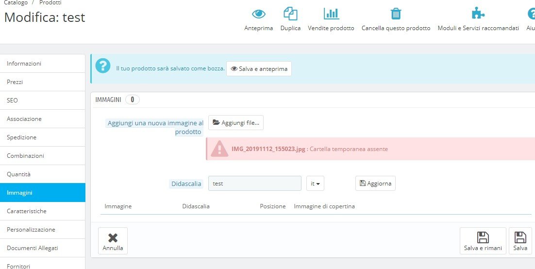 Cibi Tradizionali Posted November 18, 2019 Share Posted November 18, 2019 Buonasera, non riesco più a caricare le immagini dei prodotti. Versione PS 1.6.20. Nel log degli errori riporta "PHP Warning: File upload error - unable to create a temporary file in Unknown on line 0". La schermata del BO invece è la seguente. Link to comment Share on other sites More sharing options...