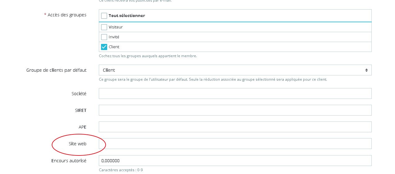 AlexanderOs Posted November 20, 2019 Share Posted November 20, 2019 Bonjour Vous pouvez récupérer et afficher le lien du site à partir du fichier my-account.tpl. Si vous utilisez le thème classic voici le chemin "classic\templates\customer\my-account.tpl". Apres il ne reste plus qu'a l'éditer en ajoutant après la condition "$customer.addresses|count" : {if $customer.website|count} <a class="col-lg-4 col-md-6 col-sm-6 col-xs-12" id="addresses-link" href="{$customer.website}" target="_blank"> <span class="link-item"> <i class="material-icons">public</i> {l s='Site Web' d='Shop.Theme.Customeraccount'} </span> </a> {/if} Vider le cache Et voila 😎 Link to comment Share on other sites More sharing options...