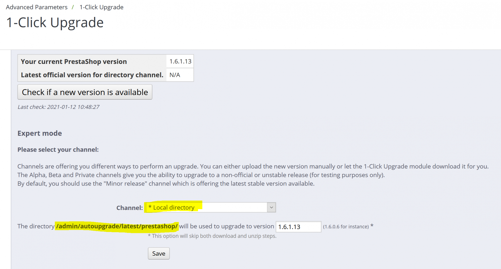 glennlawre Posted January 12, 2021 Author Share Posted January 12, 2021 As this was over 1 year ago, I'm trying to remember exactly what I did... As far as I recall, I think I used the Auto-Upgrade module and selected the "*Local directory" option to complete the upgrade. To do this you need to upload an un-zipped version of the install files (for the version you want to upgrade to) to the directory highlighted in the image below and then select the various options before clicking to perform the update. Just be sure to do a full back-up of all files and your DB before attempting as I have had this fail in the past and had to restore. I hope this helps... Link to comment Share on other sites More sharing options...