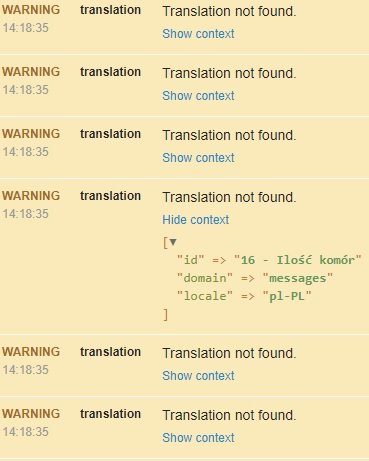 W szczegółach są logi wskazujące na ostrzeżenie dotyczące tłumaczenia. Pojawia się na żółto kilkaset logów "Translation not found", że niby nie są przetłumaczone cechy i inne podobne. Jest niedobrze. Nigdy wcześniej nic takiego się nie pojawiało a przez sklep już się przewijało trochę produktów.