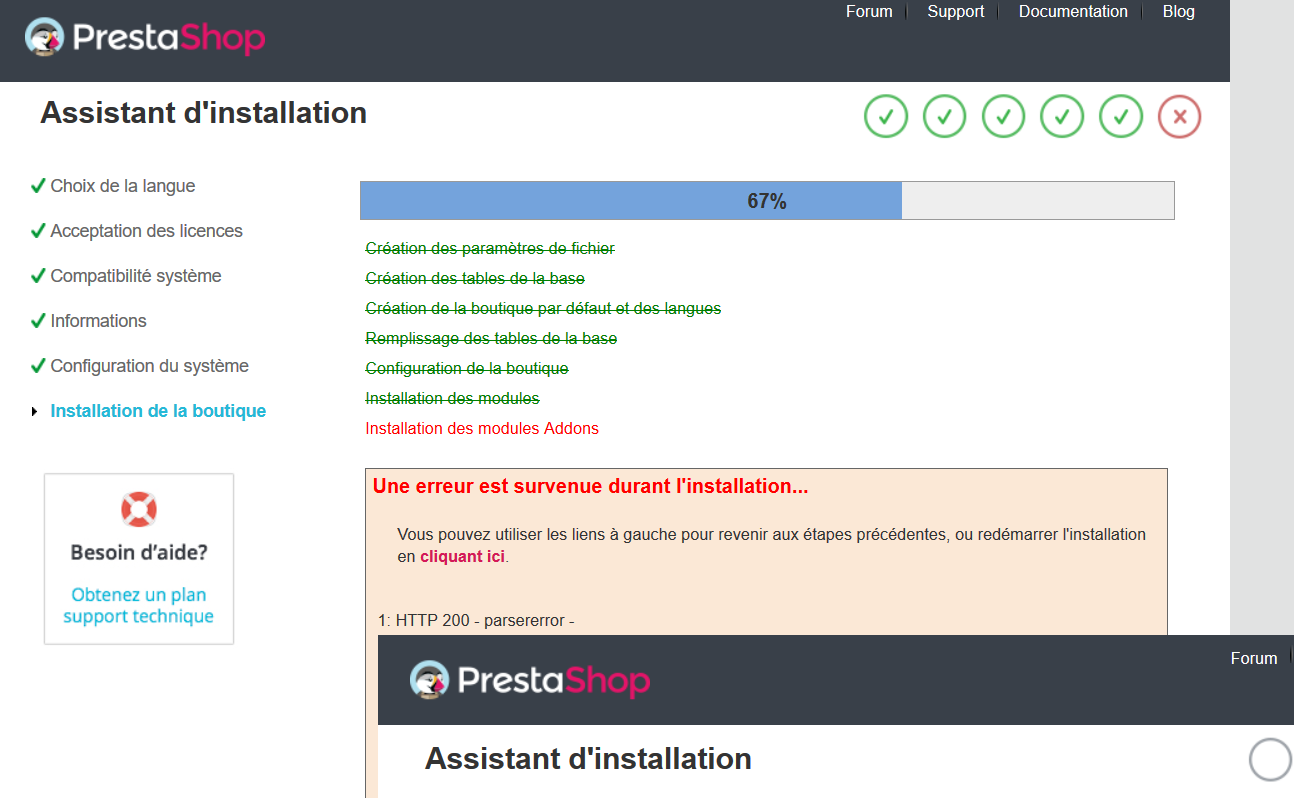 Lorsque j'essaye d'installer PrestaShop 1.7.6.2 sur mon VPS, l'installation plante toujours au même moment.