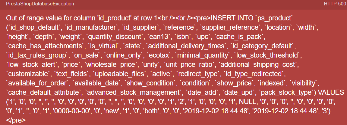 prestalinks Posted December 2, 2019 Share Posted December 2, 2019 Hello, I migrated prestashop 1.7.4 to 1.7.6. everything works fine. But, when I click on "New Product" on the catalog, it redirects me to the backoffice home page. I activated the debug mode, and I get the following message : Out of range value for column 'id_product' at row 1 I hope someone can help me to fix the problem :(. Thank you for any help Link to comment Share on other sites More sharing options...