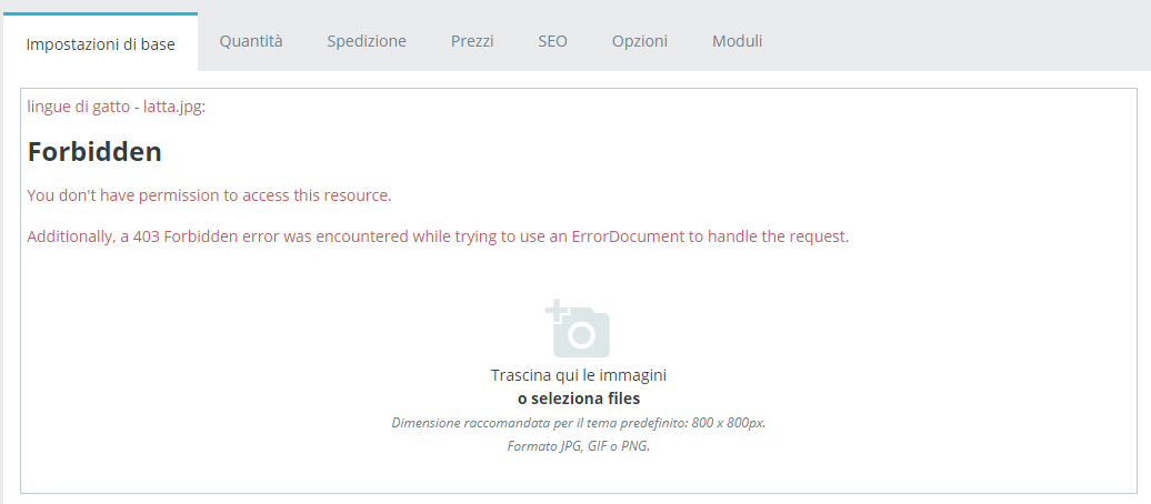 Gianluca Bergomi Posted December 9, 2019 Share Posted December 9, 2019 (edited) Buongiorno, il mio e-commerce è online e funzionante con circa 50 prodotti correttamente configurati. Stamattina all'improvviso non riesco più a caricare immagini nei mie prodotti. Come potete vedere nell'immagine l'errore che mi viene restituito è il seguente: Quote Forbidden You don't have permission to access this resource. Additionally, a 403 Forbidden error was encountered while trying to use an ErrorDocument to handle the request. Non capisco cosa possa essere successo visto che il codice è tutto sotto GIT e non vi sono modifiche. Quando cerco di caricare l'immagine prestashop fa una chiamata a https://miosito.com/cartellaprestashop/cartellabackend/index.php/sell/catalog/products/image/upload/78?_token=R7y74PwdAGgbO0cha4shBIkI6BrTJSqRICBfavtVnCQ ed è questa che restituisce 403. Come dicevo i permessi non li ho cambiati, nemmeno il file .htaccess. Grazie in anticipo Edited December 10, 2019 by Gianluca Bergomi (see edit history) Link to comment Share on other sites More sharing options...