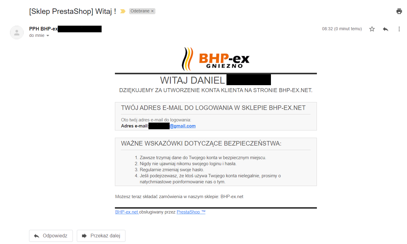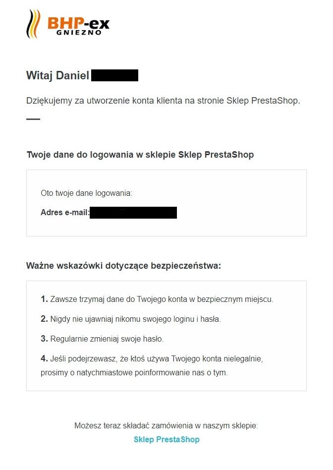 Sklep póki co nie jest uruchomiony dla klientów, jestem na etapie wrzucania towaru na sklep. Dziś założyłem lipne konto z ciekawości i dostałem mejla jak na załączonym screenie.