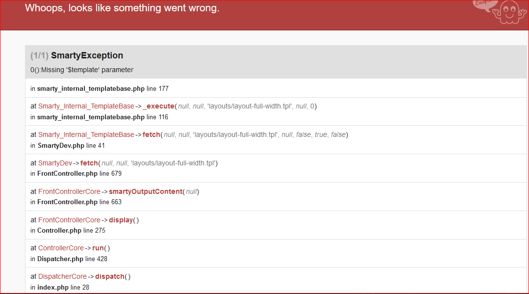 sqmzzz_ Posted December 12, 2019 Author Share Posted December 12, 2019 5 hours ago, selectshop.at said: You are using third party module ? Seems that one of the modules you are using is not compatible with your theme. Activate debug mode and name here the whole error you are getting, not only parts of it. Prestashop version in use is ? PHP version in use is ? In future please provide detailed informations in your posts. You will get answers more rapidly, instead of additional questions. Here is a list of information that are needed when you are having errors: Installation type (new/update): Update PrestaShop version: PrestaShop version: 1.7.4.4 Theme (default/customized): Classic Code (original/modified): Original Hosting: Don't know at the moment. PHP version: 7.1.3 MySQL version: 5.6.45 Browser(s) concerned: all (1/1) SmartyException 0():Missing '$template' parameter in smarty_internal_templatebase.php line 177 at Smarty_Internal_TemplateBase->_execute(null, null, 'layouts/layout-full-width.tpl', null, 0)in smarty_internal_templatebase.php line 116 at Smarty_Internal_TemplateBase->fetch(null, null, 'layouts/layout-full-width.tpl', null, false, true, false)in SmartyDev.php line 41 at SmartyDev->fetch(null, null, 'layouts/layout-full-width.tpl')in FrontController.php line 679 at FrontControllerCore->smartyOutputContent(null)in FrontController.php line 663 at FrontControllerCore->display()in Controller.php line 275 at ControllerCore->run()in Dispatcher.php line 428 at DispatcherCore->dispatch()in index.php line 28 Link to comment Share on other sites More sharing options...
