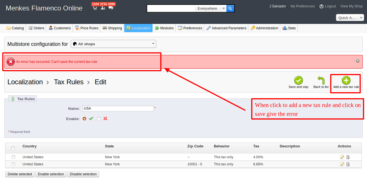 jyotidesh Posted December 13, 2019 Share Posted December 13, 2019 I have two stores named "Rest of the World" and "USA and Canada". When I am trying to add the Tax rule in "USA and Canada" store then it is giving me following reply : "An error has occurred: Can't save the current tax rule". Can anybody please help. I have also attached screenshots for reference . Thank you in advance. Link to comment Share on other sites More sharing options...