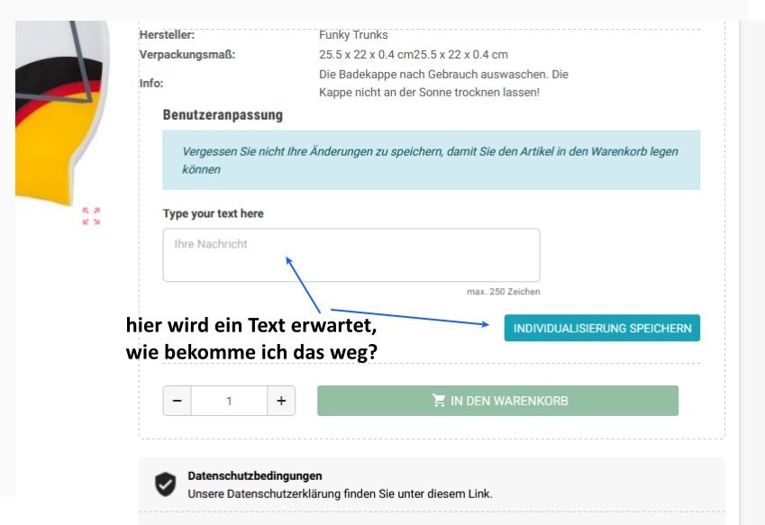 AMSPO24-Online Posted December 15, 2019 Share Posted December 15, 2019 Moin Moin, bei der folgenden Sache wird immer eine Eingabe erwartet: "Benutzeranpassung / Vergessen Sie nicht Ihre Änderungen zu speichern, damit Sie den Artikel in den Warenkorb legen können Type your text here" -> siehe Bild! Diese Einstellung brauche ich nicht und komischerweise sind auch Artikel vorhanden wo dieses Feld nicht vorhanden ist. Wo deaktiviere ich das bzw. es soll so angezeigt werden wie das zweite Bild! Link to comment Share on other sites More sharing options...