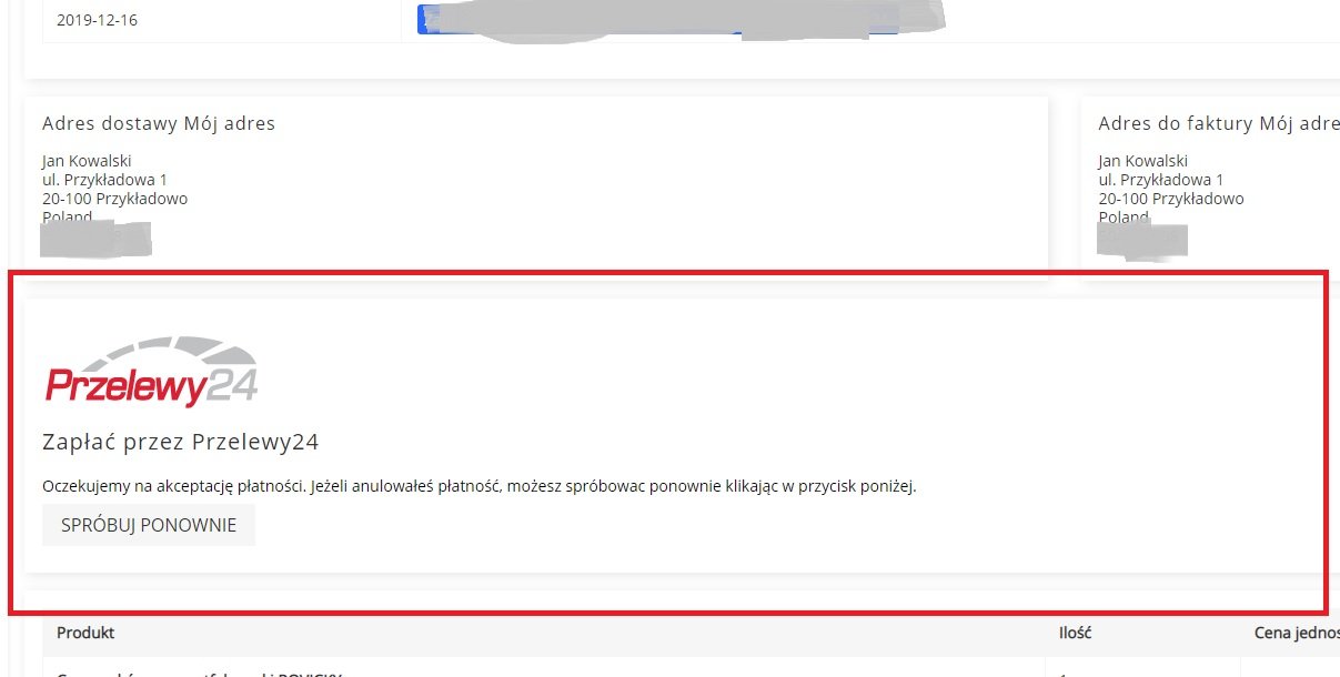 Od wczoraj męczę się z pewną rzeczą. Zarejestrowałem się w Przelewy24 i uruchomiłem ich aplikację. Działa prawidłowo. Po zakupie w panelu klienta w szczegółach zamówienia jest dostępny box, div czy jak to nazwać ale tylko w pierwszym etapie zamówienia - w gołej preście jest to chyba potwierdzenie złożenia zamówienia.