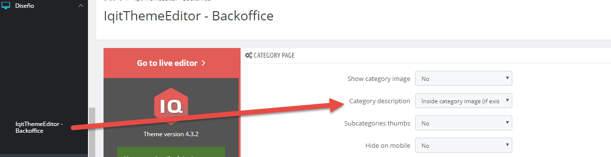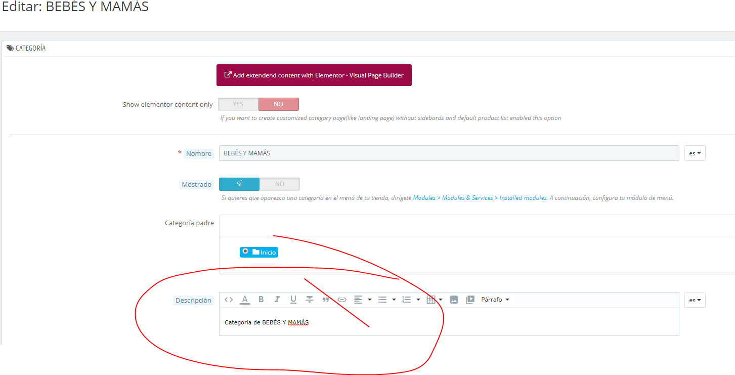 Prestafan33 Posted December 21, 2019 Share Posted December 21, 2019 (edited) En /themes/warehouse/templates/catalog/listing/category.tpl Te pongo un ejemplo de cómo podría estar (no te lo tomes al pie de la letra, no está sacado exactamente del tema que tú usas): {block name='product_list_header'} <div class="block-category card card-block"> <h1 class="h1">{$category.name}</h1> <div class="row"> {if $category.description} <div id="category-description" class="text-muted {if $category.image.large.url}col-md-9{else}col-md-12{/if}">{$category.description nofilter}</div> {/if} [...] La parte que te interesa es la de $category.description. Es posible que en tu archivo de plantilla no esté o la tengas comentada. Otro ejemplo, en la plantilla "classic", ahí lo que tiene es simplemente un include del fichero: /themes/classic/templates/catalog/_partials/category-header.tpl que contiene lo siguiente, parecido al caso anterior: <div id="js-product-list-header"> {if $listing.pagination.items_shown_from == 1} <div class="block-category card card-block"> <h1 class="h1">{$category.name}</h1> <div class="block-category-inner"> {if $category.description} <div id="category-description" class="text-muted">{$category.description nofilter}</div> {/if} {if $category.image.large.url} <div class="category-cover"> <img src="{$category.image.large.url}" alt="{if !empty($category.image.legend)}{$category.image.legend}{else}{$category.name}{/if}"> </div> {/if} </div> </div> {/if} </div> Edited December 21, 2019 by Prestafan33 (see edit history) Link to comment Share on other sites More sharing options...