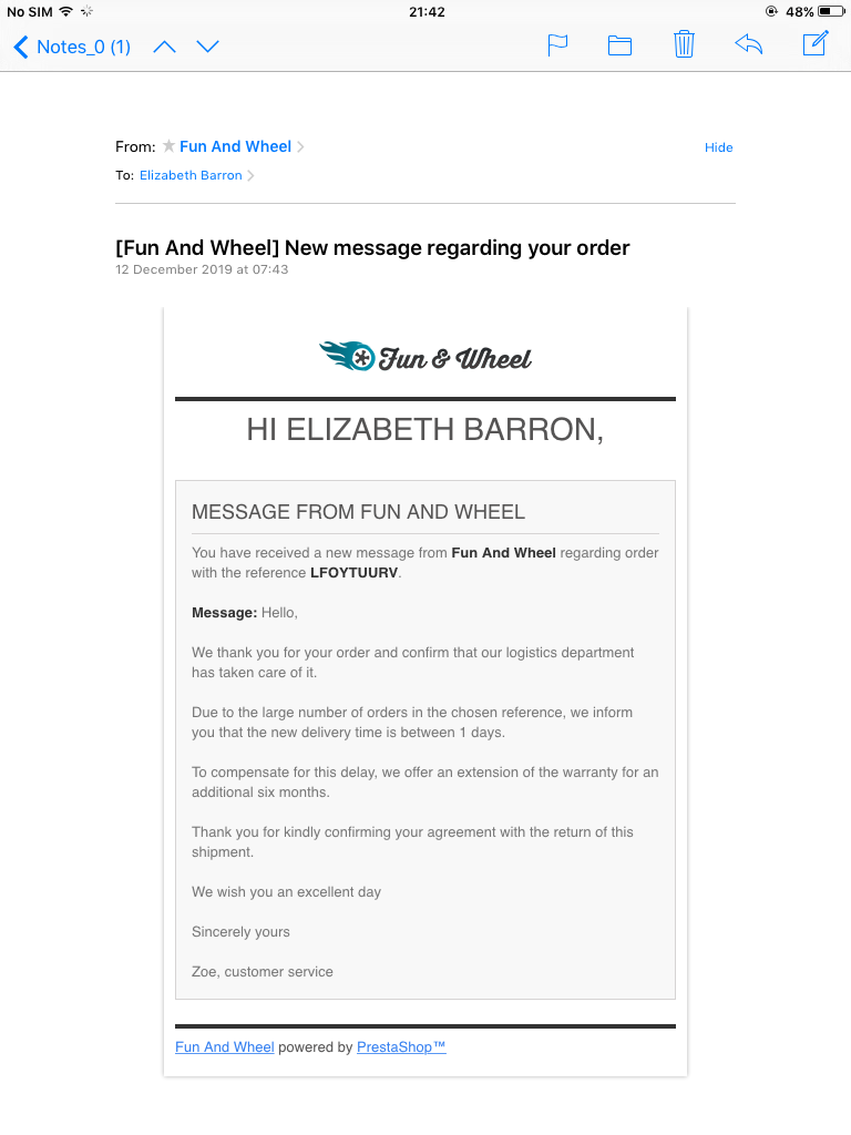 @Elizabeth Barron From where are you taking the information, that Prestashop has something to do with Fun and Wheel ? You ordered nothing from Prestashop, but from Fun and Wheel ! You should add your claim about Fun and Wheel and not about Prestashop. Prestashop is a software developing company. Prestashop is not dealing with any goods. Prestashop is only the software the company Fund and Wheel is using, which BTW thousands of other e-commerce shops are using as well.