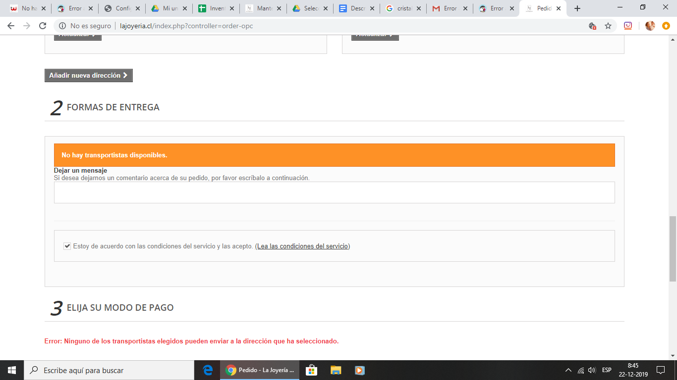 AndreMN Posted December 21, 2019 Share Posted December 21, 2019 Hola a todos! Estoy tratando de configurar los transportistas y me aparece este error. Ayuda!!! Link to comment Share on other sites More sharing options...