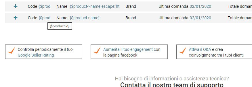 giuseppe_m Posted January 10, 2020 Author Share Posted January 10, 2020 Problema risolto. Le variabili corrette sono data-idproduct="{$product.reference}" data-productname="{$product.name}" Nel mio caso, utilizzando il thema Warehouse: aggiungendo una custom tab (nonostante vengano abilitati i campi Iframe nell'html) i dati NON venivano convertiti correttamente nella bacheca feedaty. Quindi, per risolvere, è stato necessario inserire lo script html direttamente nel template delle Tab (ho creato una tab aggiuntiva fissa direttamente nel template .tpl) Saluti 1 Link to comment Share on other sites More sharing options...