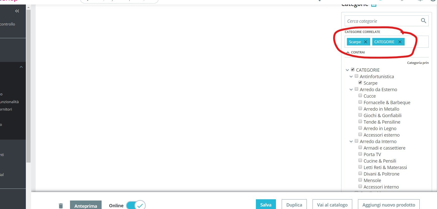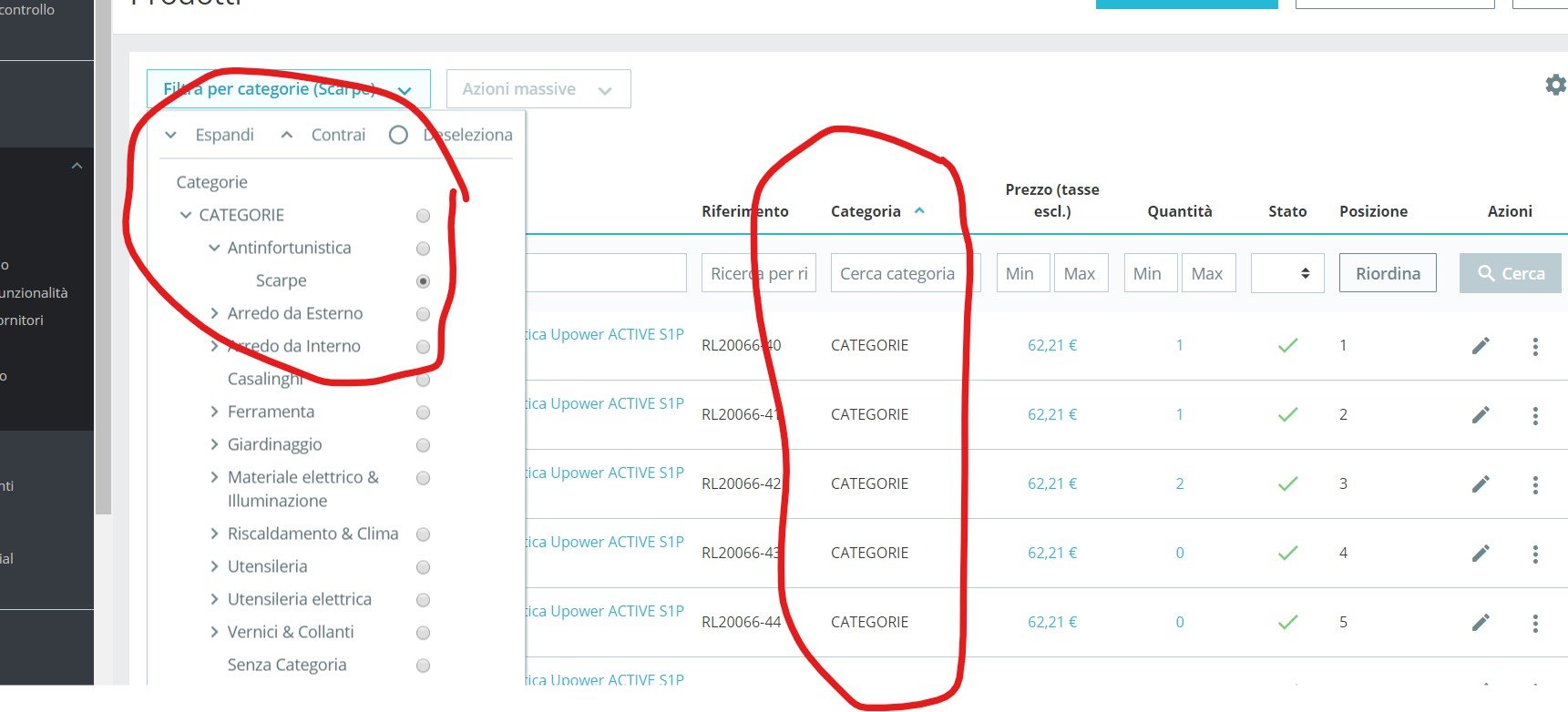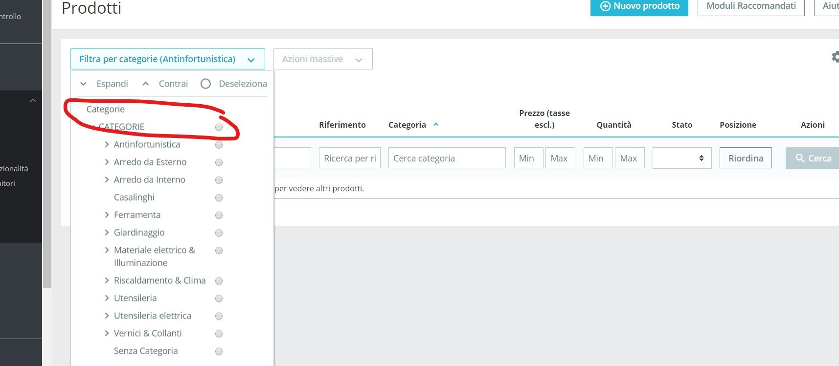 Antonashop Posted January 2, 2020 Share Posted January 2, 2020 Salve, utilizzo la versione di ps 1.7.5.0. Nel riorganizzare nel categorie del mio negozio, oggi ho "ingenuamente" eliminato tutte le categorie precedenti, quindi selezionato assegna alla categoria più alta, creato le nuove categorie e inserito in prodotti, il tutto tramite file import excel, il problema da risolvere attualmente è che ad alcuni prodotti è stata assegnata oltre alla categoria esatta anche la categoria superiore, quindi nella ricerca non si capisce nulla. Esiste un modo per eliminare da tutti i prodotti, massivamente, la categoria errata e lasciare solo quella esatta? Potete provare andando in antinfortunistica > scarpe sono presenti prodotti che non vi entrano nulla, non capisco il motivo www.antonashop.it Link to comment Share on other sites More sharing options...