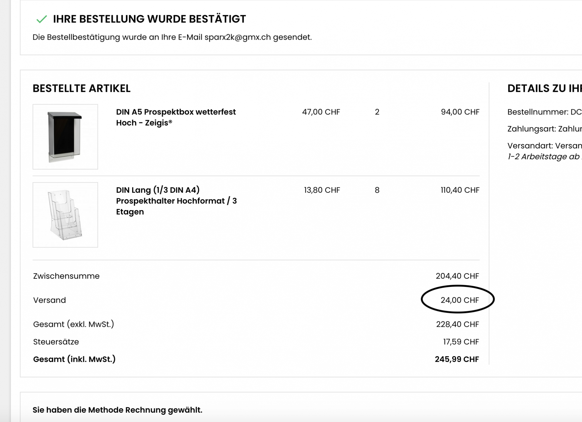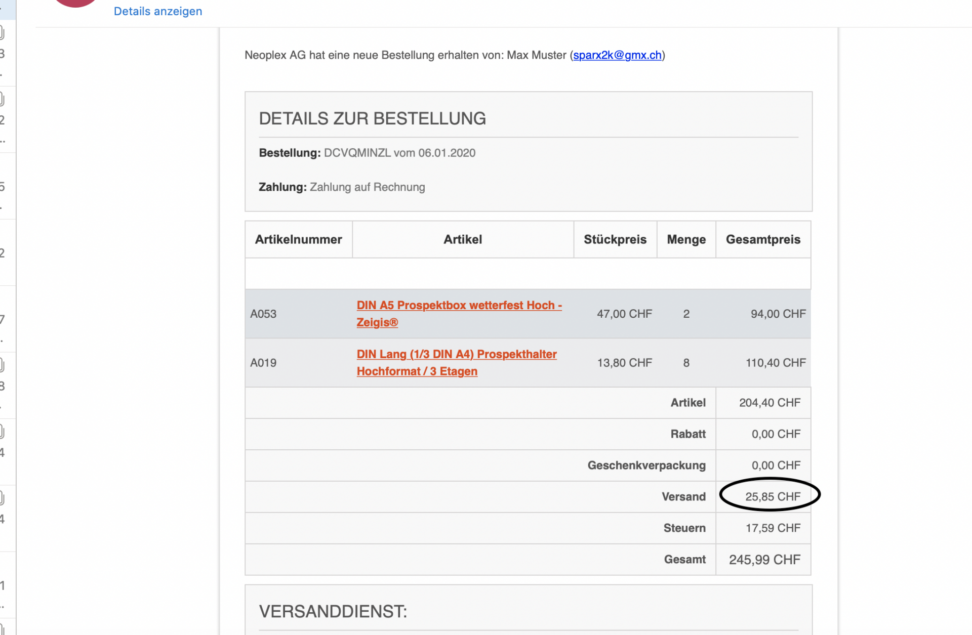 Fletsch Posted January 6, 2020 Author Share Posted January 6, 2020 9 hours ago, rictools said: Wieso fügst du Screenshots nicht hier ein (ich öffne ungern so seltsame Links ...)? Wahrscheinlich nutzt du ein Modul für die Schweizer Rappenrundung und da ist vielleicht etwas nicht richtig eingestellt. Hallo und danke für die Antwort. Bei mehreren Screenshots ist das Tool Lightshot in Firefox ziemlich praktisch. Man kann die Screenshots gleich hochladen und kriegt den Link. Habs also aus praktischen Gründen so gemacht. Aber ich lade die Screenshots gerne auch noch so rein. Ich habe das Modul zur Rappenrundung testeshalber deaktiviert aber leider liegt der Fehler auch dann vor. Hat demfall nichts mit dem Modul zu tun. Alles korrekt während dem ganzen Checkoutprozess: Aber in der Bestätigungs-Mail stimmt die Rechnung nicht mehr. Müssten ebenfalls 24.- für Versand sein: LG Link to comment Share on other sites More sharing options...