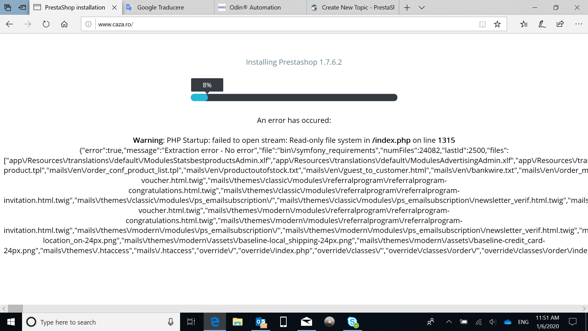 Mircea Zaharia Posted January 6, 2020 Share Posted January 6, 2020 Hello, I'm new and not an expert.... I try to install Prestashop 1.7.6.2 and at 8% installation stop and display this message :Â An error has occured: Warning: PHP Startup: failed to open stream: Read-only file system in /index.php on line 1315 {"error":true,"message":"Extraction error - No error","file":"bin\/symfony_requirements","numFiles":24082,"lastId":2500,"files": I don't know what to do. Please help me with some advice, Thanks Link to comment Share on other sites More sharing options...