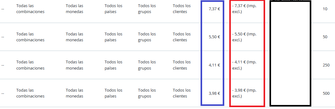tgonzalez Posted January 9, 2020 Share Posted January 9, 2020 (edited) Hola estoy intentando crear precios específicos, parece que los comandos lo hago bien, pero cuando añado productos al carro más de 10, le aparecen a los clientes como de 0€ ¿qué estoy haciendo mal? <?php $precio=5000; //precio sin comas $precioOri=65.00;//precio original $from = date("Y") . "-" . date("m") . "-" . date("d") . " 00:00:00"; $DatetimeFechaActual = new DateTime("NOW"); $DatetimeFechaActual->add(new DateInterval('P2D')); $to=$DatetimeFechaActual->format("Y-m-d")." 00:00:00"; //echo $from."<br>".$to; $precioFloat=floatval(floatval($precio)/100); $specificPrice = new SpecificPrice(); $specificPrice->id_product = $id; // $specificPrice->id_product_attribute = (int)$id_product_attribute; $specificPrice->id_shop = 0; //$specificPrice->id_shop_group = $this->context->shop->id_shop_group; $specificPrice->id_currency = 0; $specificPrice->id_country = Tools::getValue('sp_id_country'); $specificPrice->id_group = 0; $specificPrice->id_customer = 0; $specificPrice->price = $precioFloat; $r=($precioFloat/$precioOri*100); $r=abs(abs($r)-100); $specificPrice->reduction=(float)$precioFloat; $specificPrice->reduction_type="amount"; $specificPrice->reduction_tax = 0; //$specificPrice->price=$precio; $specificPrice->from_quantity =(int) $cantidad; $specificPrice->from = $from; $specificPrice->to = $to; $specificPrice->add(); $addedPriceId = $specificPrice->id; ?> Creo que lo he hecho bien, alguien me puede echar un cable Edited January 9, 2020 by tgonzalez (see edit history) Link to comment Share on other sites More sharing options...