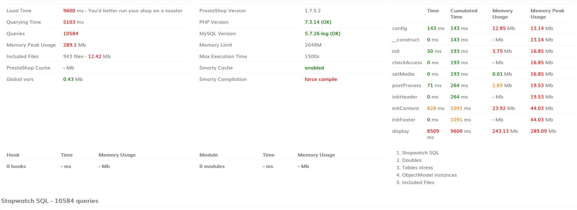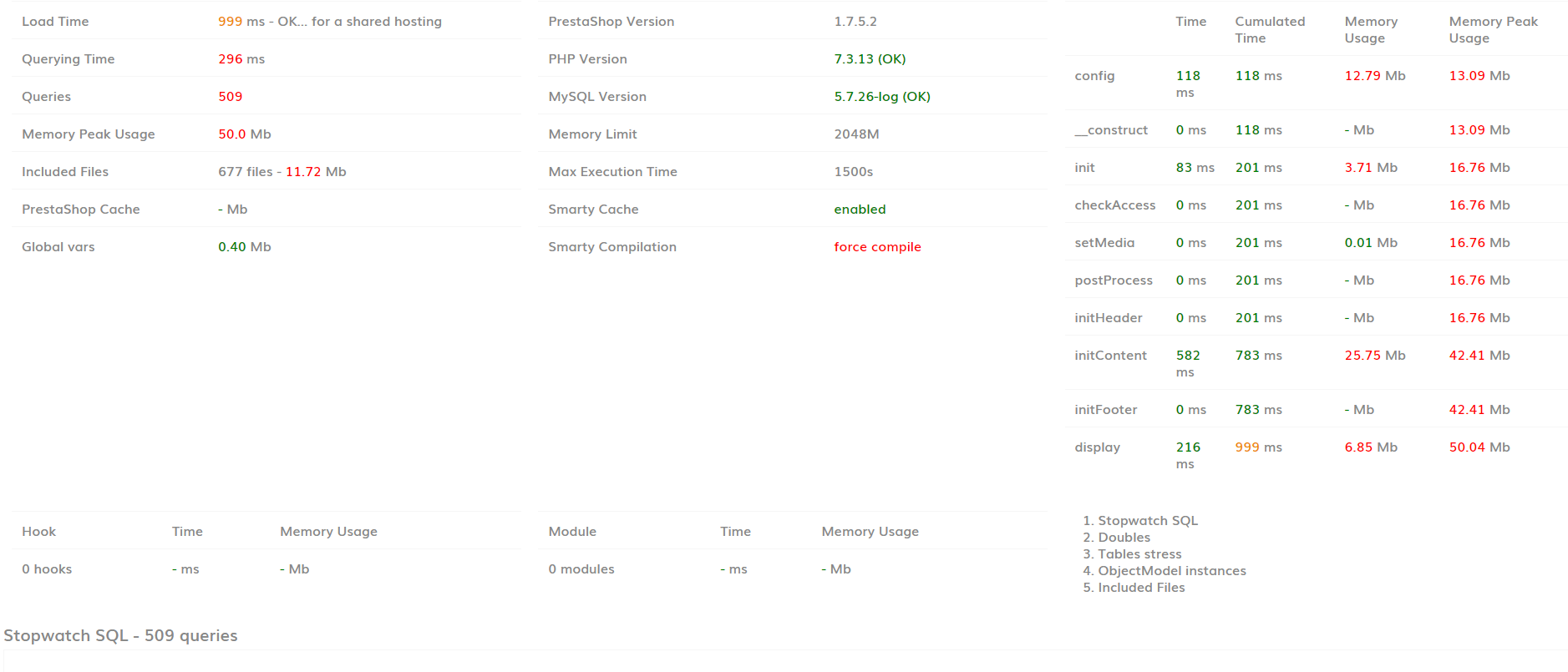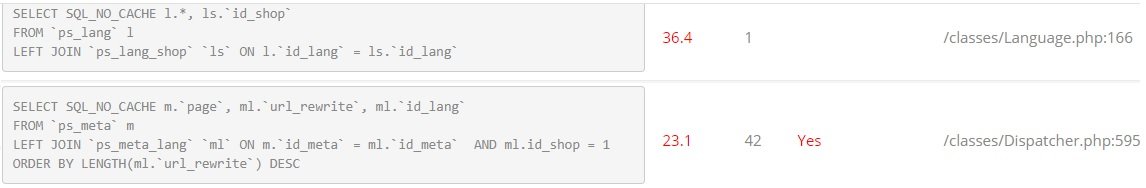 musicmaster Posted January 16, 2020 Share Posted January 16, 2020 You miss the important part of _PS_DEBUG_PROFILING_. It shows all the queries that are made and how long they take. That will tell you which queries took most time. It could very well be just one query. And that might point you to the culprit. You mention that you did two things - removing modules and emptying some tables - that helped. It might help to do some additional experiments to determine which of the two cause the problem. 1 second is not really slow. And given that just a third of this is querying time I doubt whether there is a real problem there. It might just be that your shared server is rather busy and takes a lot of time reading files. 1 Link to comment Share on other sites More sharing options...