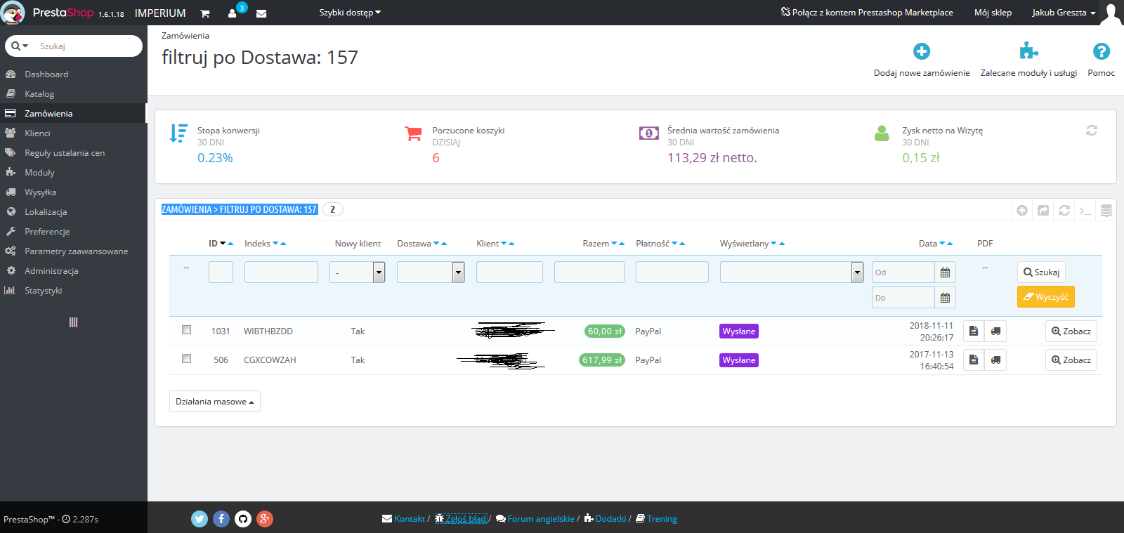 imperiumsklep Posted January 30, 2020 Share Posted January 30, 2020 Cześć. Mam problem (w zasadzie od zawsze) z przejściem na drugą lub dalszą stronę zamówień. Ustawienie 100, czy 150 koszyków na jednej stronie też zawsze odsyła do dwóch starych koszyków. Wyświetla się komunikat: Zamówienia > filtruj po Dostawa: 157 Jak filtruje po dacie to też mi nic nie znajduje i cały czas pokazuje to "157" co może być kluczowe. Może ktoś pomóc? Zamówienia > filtruj po Dostawa: 157, Data: 2020-01-02 - 2020-01-10 Link to comment Share on other sites More sharing options...