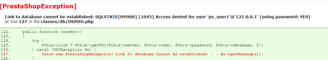 see_k Posted January 31, 2020 Author Share Posted January 31, 2020 dann bekomme ich das Fatal error: Uncaught PDOException: SQLSTATE[HY000] [1045] Access denied for user 'ps_user1'@'127.0.0.1' (using password: YES) in /home/httpd/vhosts/seekajak.ch/httpdocs/presta/vendor/doctrine/dbal/lib/Doctrine/DBAL/Driver/PDOConnection.php:43 Stack trace: #0 /home/httpd/vhosts/seekajak.ch/httpdocs/presta/vendor/doctrine/dbal/lib/Doctrine/DBAL/Driver/PDOConnection.php(43): PDO->__construct('mysql:host=127....', 'ps_user1', '27rYf9%%-750Hk', Array) #1 /home/httpd/vhosts/seekajak.ch/httpdocs/presta/vendor/doctrine/dbal/lib/Doctrine/DBAL/Driver/PDOMySql/Driver.php(44): Doctrine\DBAL\Driver\PDOConnection->__construct('mysql:host=127....', 'ps_user1', '27rYf9%%-750Hk', Array) #2 /home/httpd/vhosts/seekajak.ch/httpdocs/presta/vendor/doctrine/dbal/lib/Doctrine/DBAL/Connection.php(360): Doctrine\DBAL\Driver\PDOMySql\Driver->connect(Array, 'ps_user1', '27rYf9%%-750Hk', Array) #3 /home/httpd/vhosts/seekajak.ch/httpdocs/presta/vendor/doctrine/dbal/lib/Doctrine/DBAL/Connection.php(942): Doctrine\DBAL\Connection->connect() #4 /home/ht in /home/httpd/vhosts/seekajak.ch/httpdocs/presta/vendor/doctrine/dbal/lib/Doctrine/DBAL/Driver/AbstractMySQLDriver.php on line 103 Habe aber die DB getestet und es ging... Link to comment Share on other sites More sharing options...