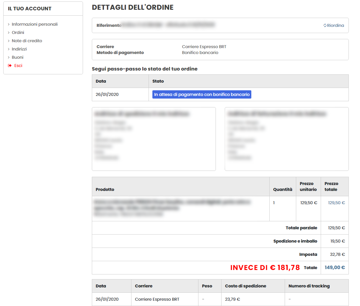 alagias Posted February 1, 2020 Share Posted February 1, 2020 Salve, come da oggetto, nel riepilogo dei costi (Su front-end in "dettaglio dell'ordine" in "area clienti") non somma gli importi correttamente. Come da screen allegato noterete che somma solo "Totale parziale" e "Spedizione e imballaggio" lasciando le tasse al di fuori dell'addizione. Questo accade anche per il "dettaglio dell'ordine" in modalità ospite. Cosa importante: lo store è settato con prezzi iva esclusa resto in attesa di un riscontro Link to comment Share on other sites More sharing options...