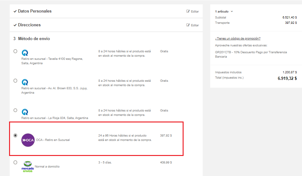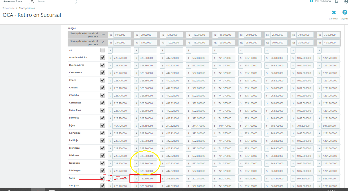 MariaGracia Posted February 1, 2020 Share Posted February 1, 2020 Buen dia! Ahora esta funcionando, pero no esta tomando bien los valores. Por ejemplo, yo realizo la compra y selecciono retiro de sucursal del transportista en la misma ciudad desde donde se realiza el envío a donde yo resido y me toma el valor de otra provincia. Yo vivo en Salta, Argentina, mi sucursal de empresa esta en la misma ciudad y el peso en este caso de mi producto es de 2.7 KG. Como marco en la configuración de transporte, me debería cobrar $182.80 + iva (21%) en total $221.18 y esta tomando el valor de otras provincias como marco en amarillo. Tendrá que ver con alguna configuración de localización? Como puedo solucionar? Link to comment Share on other sites More sharing options...