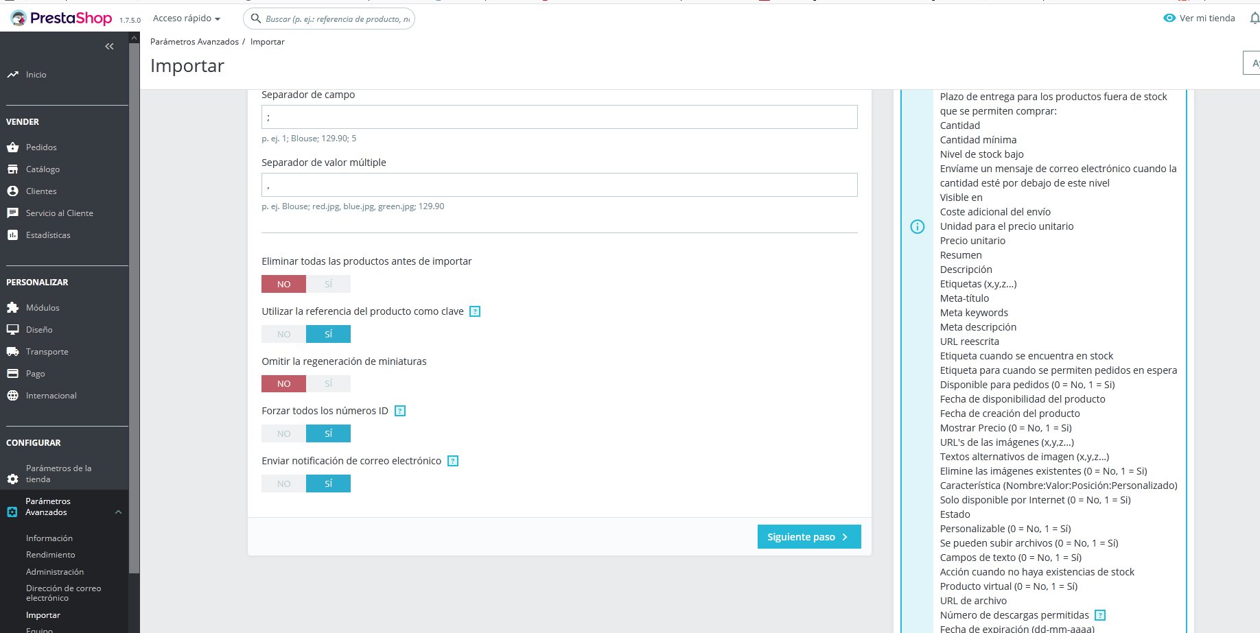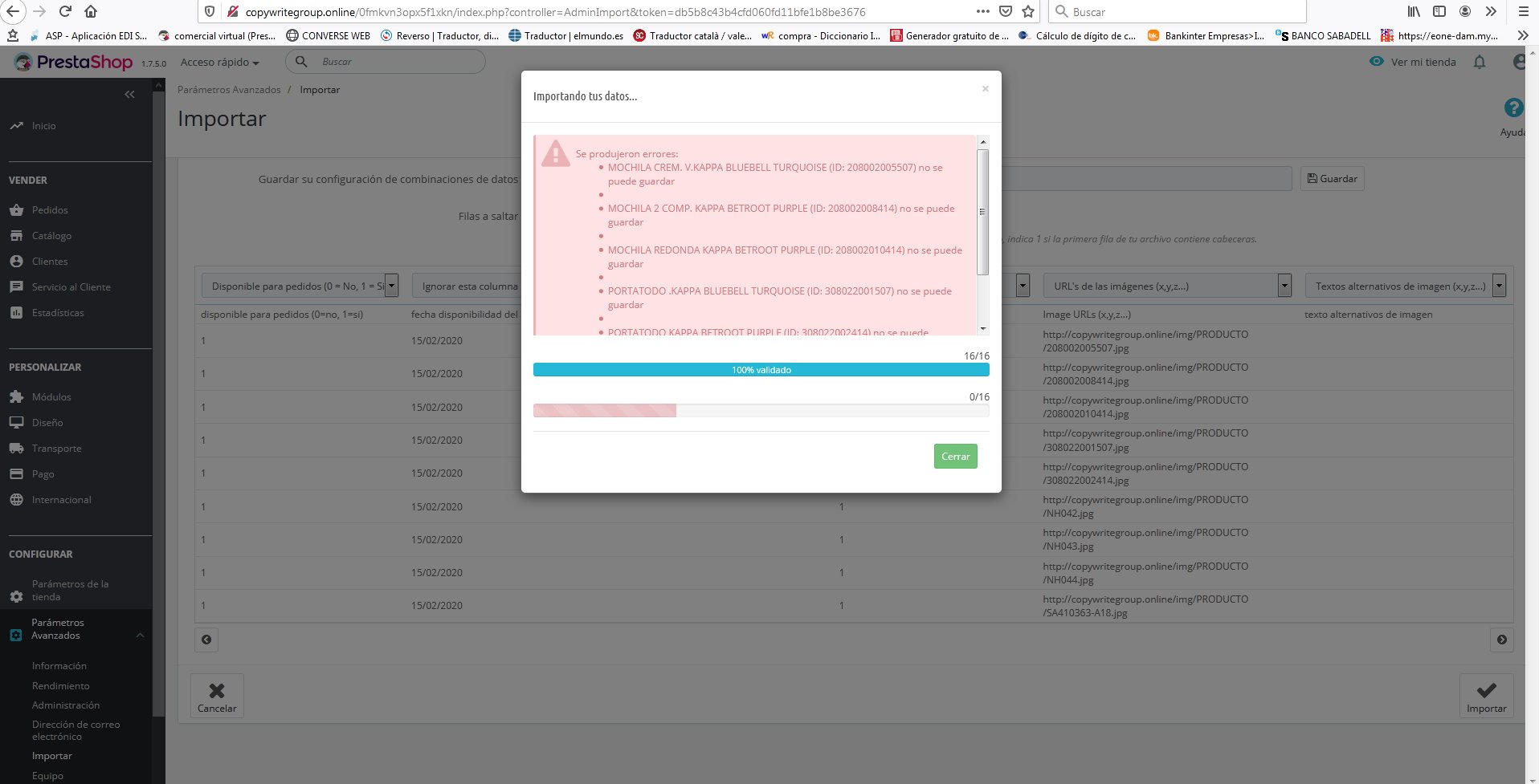 CEG_cial virtual Posted February 12, 2020 Author Share Posted February 12, 2020 20 minutes ago, gusman126 said: Desactiva los modulos que no sean de Prestashop o de la plantilla, alguno debe estar interfiriendo Puede que con la opcion de desactivar modulos NO nativos, puede que funcione. ya nos dices hola 😟 todos los modulos desactivados: Os copio tambien las opciones seleccionadas al importar, por si hay algo que no debe: y como resultado = el mismo error ¡! no lo entiendo de verdad. A ver no soy una experta pero veo todo el programa bastante intuitivo y todo ha ido bien hasta ahora. Es bastante desesperante por favor, ¿alguna otra idea? 😣 gracias! Link to comment Share on other sites More sharing options...