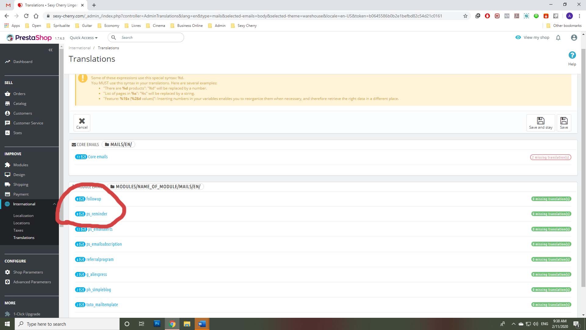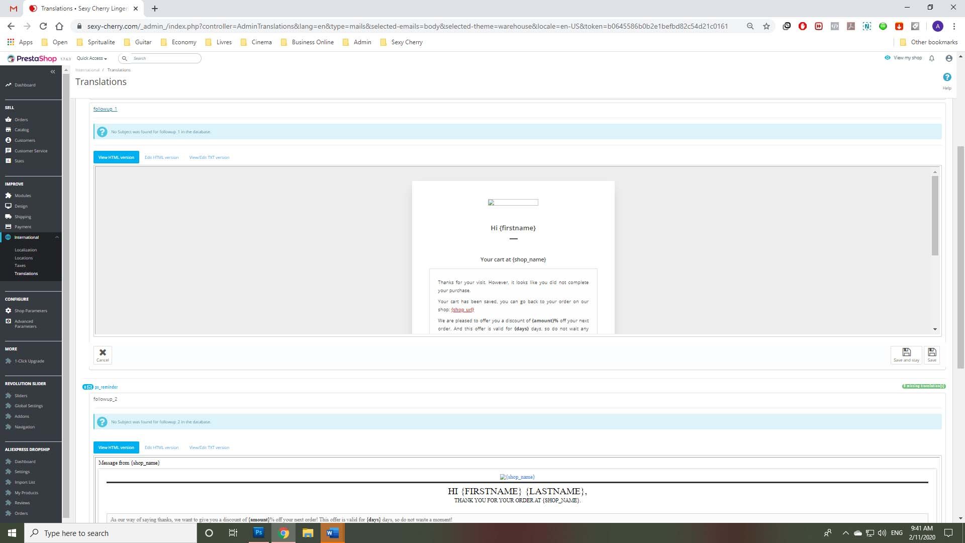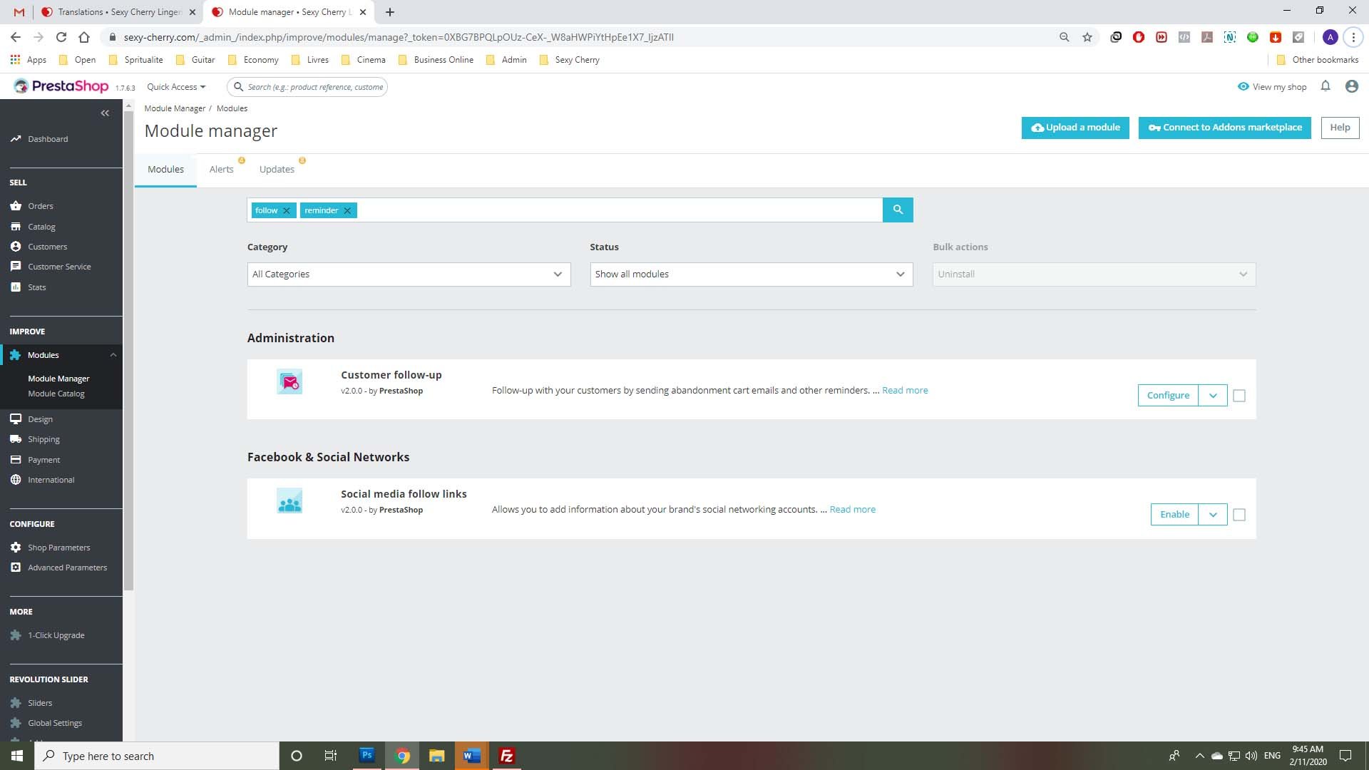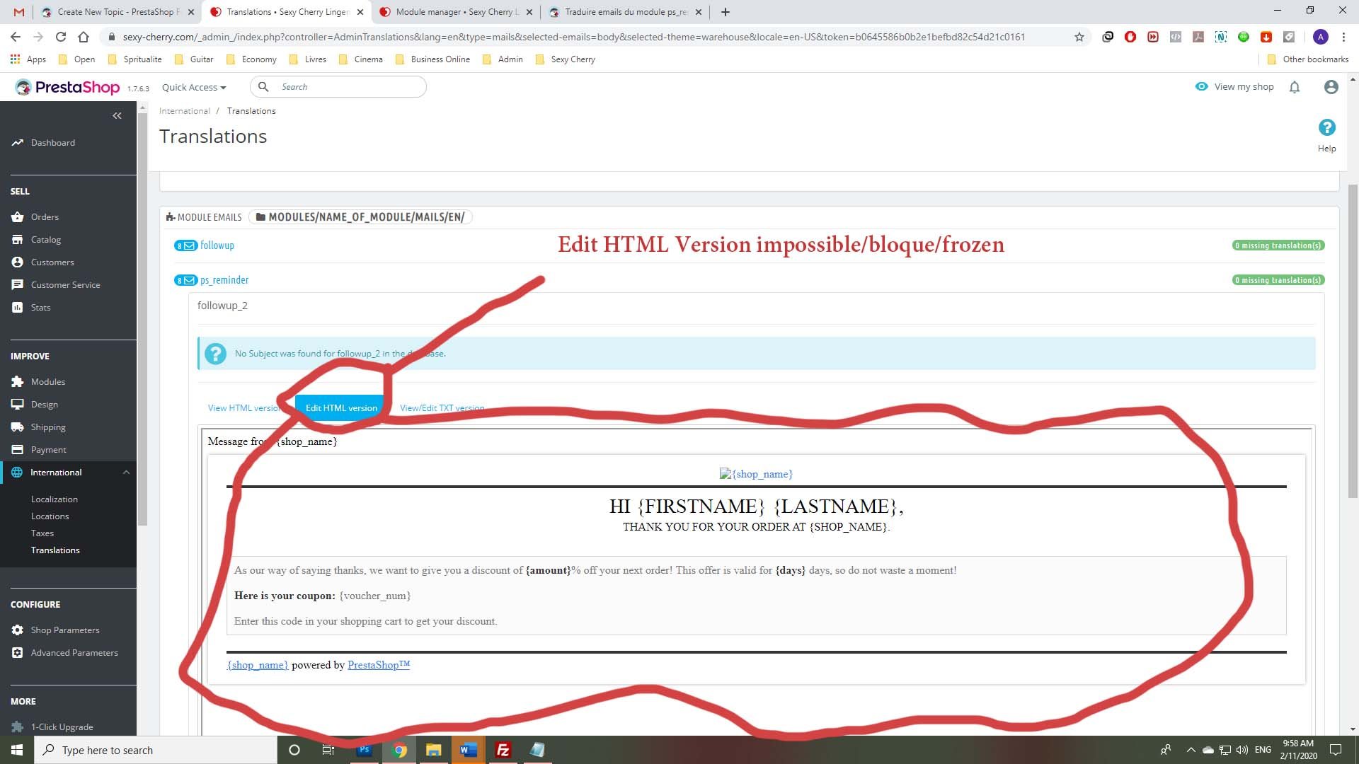 superskyman100 Posted February 11, 2020 Share Posted February 11, 2020 Hello, I'm on PS 1.7.6 1- I have to translate emails from the modules PS_reminder and/or Followup. These two modules are concomitant : which one is the 'good' one ?.... 2- I can modify the 'Followup' emails throughout the Translation module, but PS_reminder is like frozen, i can do nothing : should i translate the PS_reminder throughout another way, anyway, cause it's the module that is affected ? It seems the two modules are installed on my FTP, but i can see only one on my BO (namely ''Customer follow up v2.0.0) This looks messy, it seems that the stuff is doubled, i don't know what to do to fix that. Any idea ? Thanks guys ! Link to comment Share on other sites More sharing options...